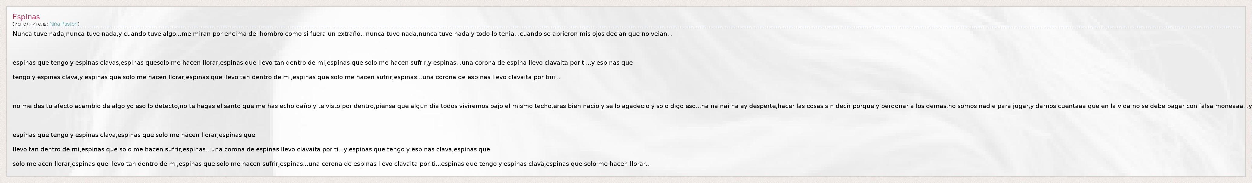 solo me acen llorar,espinas que llevo tan dentro de mi,espinas que solo me hacen sufrir,espinas...una corona de espinas llevo clavaita por ti...espinas que tengo y espinas clavà,espinas que solo me hacen llorar...