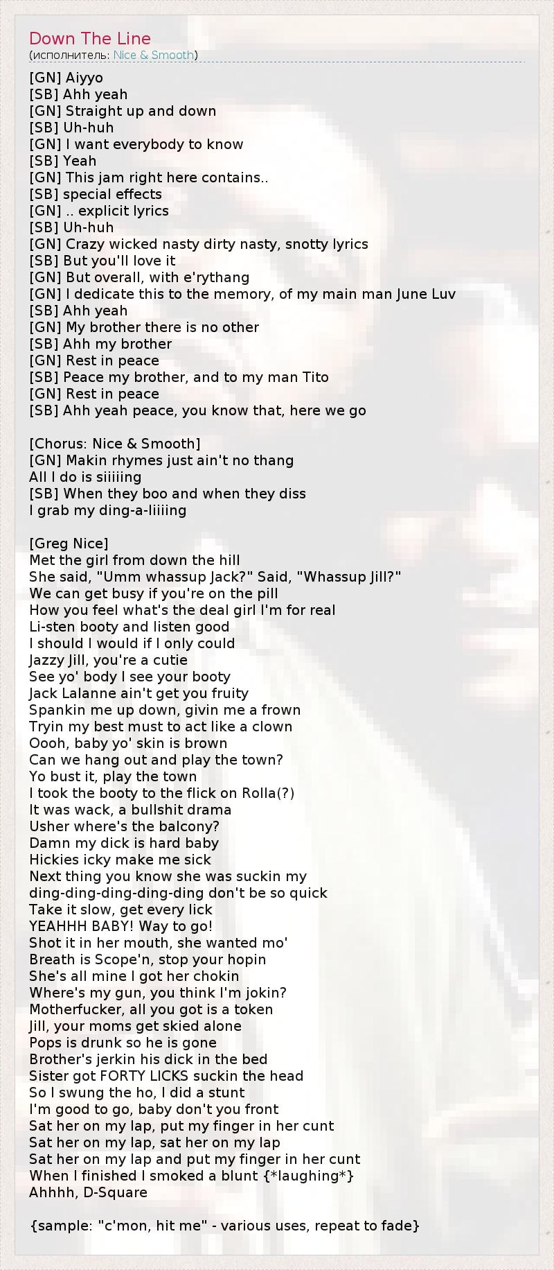 Это интересно:Nice & Smooth - хип-хоп дуэт из Нью-Йорка, в состав которого входят Greg Nice (настоящее имя Greg Mays) и Smooth B (настоящее имя Daryl Barnes).Первое появление Nice & Smooth, состоялось в песне "Pimpin Ain't Easy", выдающегося рэппера Big Daddy Kane, в его альбоме "It's a Big Daddy Thing", в 1989 году.За свою активную творческую деятельность, с конца 80-х до середины 90-х, дуэт выпустил четыре полновесных альбома.И хотя... продолжение