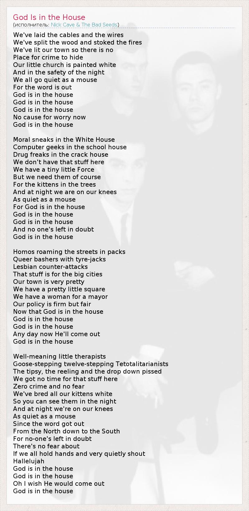 Мы проложили кабеля и провода, где только можно, Срубили все деревья и разожгли в ночи огни - Наш городок теперь освещен так ярко, что Преступникам от нас не скрыться; Церковка чисто выбелена... И, вечерами, в покое и безопасности, Мы смолкаем - тише мыши, - И, собственно, о чем говорить-то? - Ведь Бог приходит в дом. Бог в наших домах Бог в нашем домах... И волноваться не о чем: Бог с нами, в нашем доме... Лжецы и фискалы в Белом доме, Ботаники-компьютерщики в школьных классах, Торчки в крэк-хаусах* - О, все это нам здесь ни к чему... (Мы ведь вместе, ведь с нами - наша ничтожная Сила!) Пожалуй, они только на то сгодятся, Чтоб показать: и мы умеем снимать котят с деревьев! ...И вечерами, становясь на колени, Мы смолкаем, - тише мыши, - Ибо Бог приходит в дом. Бог в наших домах Бог в наших домах... И пусть никто не сомневается: Бог с нами, в наших домах... Шайки педиков в темных переулках, Маньяки-извращенцы, Лесбийские разборки - Все это для больших городов; А наш городок - милый, чистенький и безопасный, С такой очаровательной старинной площадью, И мэром у нас - женщина, И правила у нас твердые, но справедливые... И Бог - с нами. Бог в наших домах Бог в наших домах... Он всегда с нами. Бог - с нами, в наших домах... Честные, приветливые врачи, Важные "тетоталитаристы" из "Двенадцати шагов"... А пьяные, покачивающиеся, на ровном месте падающие алкаши - О нет, нам не до них. ...Преступность на нуле, волноваться не о чем, - Здесь у нас только белые котята: Вечером сам не поверишь, как спокойно у нас... Вечером, когда мы встанем на колени, Тише мыши - И, собственно, о чем говорить-то? - От Севера до Юга... И пусть никто не сомневается: Волноваться не о чем, Надо только взяться за руки и прошептать: "Аллилуйя!" ...Бог в наших домах Бог в нашем домах.. О, если б так оно и было! Бог в наших домах... *Крэк-хаус (crack house) - старое, обычно заброшенное здание, вс котором ведется торговля наркотиками. ** "Двенадцать шагов" - программа реабилитации алкоголиков и наркоманов.