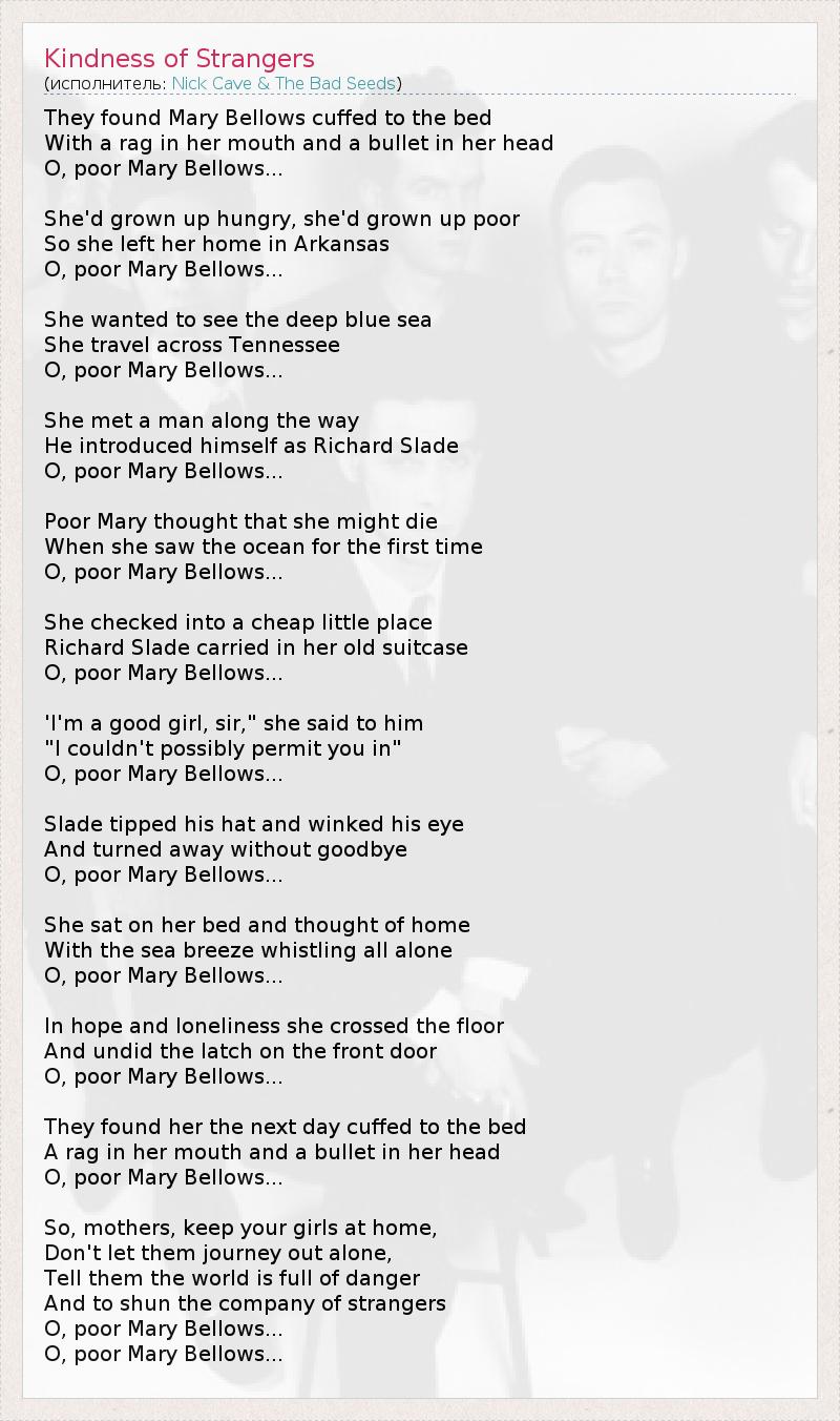 А как ты думаешь, о чем песня "Kindness of Strangers" ?