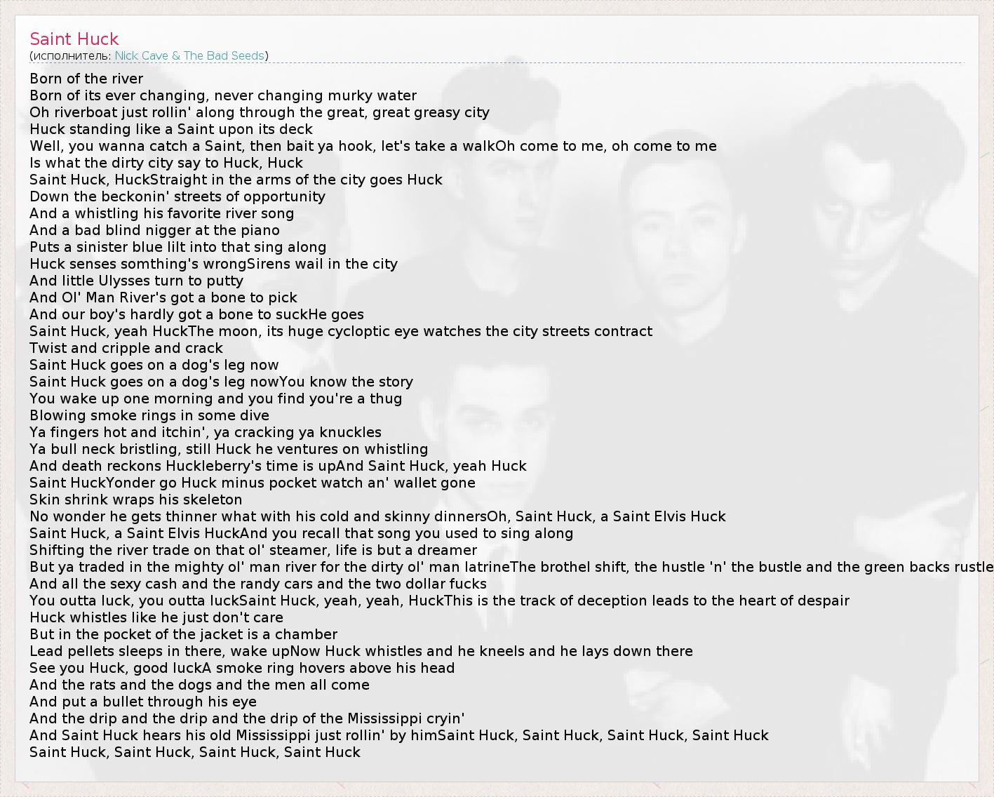 Born of the river Born of its ever changing, never changing murky water Oh riverboat just rollin' along through the great, great greasy city Huck standing like a Saint upon its deck Well, you wanna catch a Saint, then bait ya hook, let's take a walkOh come to me, oh come to me Is what the dirty city say to Huck, Huck Saint Huck, HuckStraight in the arms of the city goes Huck Down the beckonin' streets of opportunity And a whistling his favorite river song And a bad blind nigger at the piano Puts a sinister blue lilt into that sing along Huck senses somthing's wrongSirens wail in the city And little Ulysses turn to putty And Ol' Man River's got a bone to pick And our boy's hardly got a bone to suckHe goes Saint Huck, yeah HuckThe moon, its huge cycloptic eye watches the city streets contract Twist and cripple and crack Saint Huck goes on a dog's leg now Saint Huck goes on a dog's leg nowYou know the story You wake up one morning and you find you're a thug Blowing smoke rings in some dive Ya fingers hot and itchin', ya cracking ya knuckles Ya bull neck bristling, still Huck he ventures on whistling And death reckons Huckleberry's time is upAnd Saint Huck, yeah Huck Saint HuckYonder go Huck minus pocket watch an' wallet gone Skin shrink wraps his skeleton No wonder he gets thinner what with his cold and skinny dinnersOh, Saint Huck, a Saint Elvis Huck Saint Huck, a Saint Elvis HuckAnd you recall that song you used to sing along Shifting the river trade on that ol' steamer, life is but a dreamer But ya traded in the mighty ol' man river for the dirty ol' man latrineThe brothel shift, the hustle 'n' the bustle and the green backs rustle And all the sexy cash and the randy cars and the two dollar fucks You outta luck, you outta luckSaint Huck, yeah, yeah, HuckThis is the track of deception leads to the heart of despair Huck whistles like he just don't care But in the pocket of the jacket is a chamber Lead pellets sleeps in there, wake upNow Huck whistles and he kneels and he lays down there See you Huck, good luckA smoke ring hovers above his head And the rats and the dogs and the men all come And put a bullet through his eye And the drip and the drip and the drip of the Mississippi cryin' And Saint Huck hears his old Mississippi just rollin' by himSaint Huck, Saint Huck, Saint Huck, Saint Huck Saint Huck, Saint Huck, Saint Huck, Saint Huck