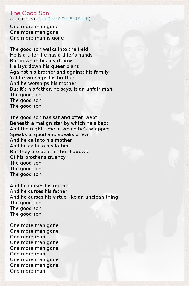После выхода мрачного и интенсивного Tender Prey некоторые поклонники были разочарованы, услышав мягкий и спокойный The Good Son. В конце 80-х Ник Кейв влюбился в бразильскую журналистку Вивиан Карнейро, с чем и связана внезапная смена настроения альбома. Сегодня альбом считается классикой, которую в своё время несправедливо осудили.