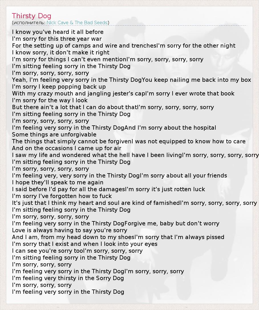 I know you've heard it all before I'm sorry for this three year war For the setting up of camps and wire and trenchesI'm sorry for the other night I know sorry, it don't make it right I'm sorry for things I can't even mentionI'm sorry, sorry, sorry, sorry I'm sitting feeling sorry in the Thirsty Dog I'm sorry, sorry, sorry, sorry Yeah, I'm feeling very sorry in the Thirsty DogYou keep nailing me back into my box I'm sorry I keep popping back up With my crazy mouth and jangling jester's capI'm sorry I ever wrote that book I'm sorry for the way I look But there ain't a lot that I can do about thatI'm sorry, sorry, sorry, sorry I'm sitting feeling sorry in the Thirsty Dog I'm sorry, sorry, sorry, sorry I'm feeling very sorry in the Thirsty DogAnd I'm sorry about the hospital Some things are unforgivable The things that simply cannot be forgivenI was not equipped to know how to care And on the occasions I came up for air I saw my life and wondered what the hell have I been livingI'm sorry, sorry, sorry, sorry I'm sitting feeling sorry in the Thirsty Dog I'm sorry, sorry, sorry, sorry I'm feeling very, very sorry in the Thirsty DogI'm sorry about all your friends I hope they'll speak to me again I said before I'd pay for all the damagesI'm sorry it's just rotten luck I'm sorry I've forgotten how to fuck It's just that I think my heart and soul are kind of famishedI'm sorry, sorry, sorry, sorry I'm sitting feeling sorry in the Thirsty Dog I'm sorry, sorry, sorry, sorry I'm feeling very sorry in the Thirsty DogForgive me, baby but don't worry Love is always having to say you're sorry And I am, from my head down to my shoesI'm sorry that I'm always pissed I'm sorry that I exist and when I look into your eyes I can see you're sorry tooI'm sorry, sorry, sorry I'm sitting feeling sorry in the Thirsty Dog I'm sorry, sorry, sorry I'm feeling very sorry in the Thirsty DogI'm sorry, sorry, sorry I'm feeling very thirsty in the Sorry Dog I'm sorry, sorry, sorry I'm feeling very sorry in the Thirsty Dog