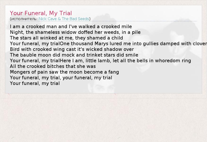 А как ты думаешь, о чем песня "Your Funeral, My Trial" ?