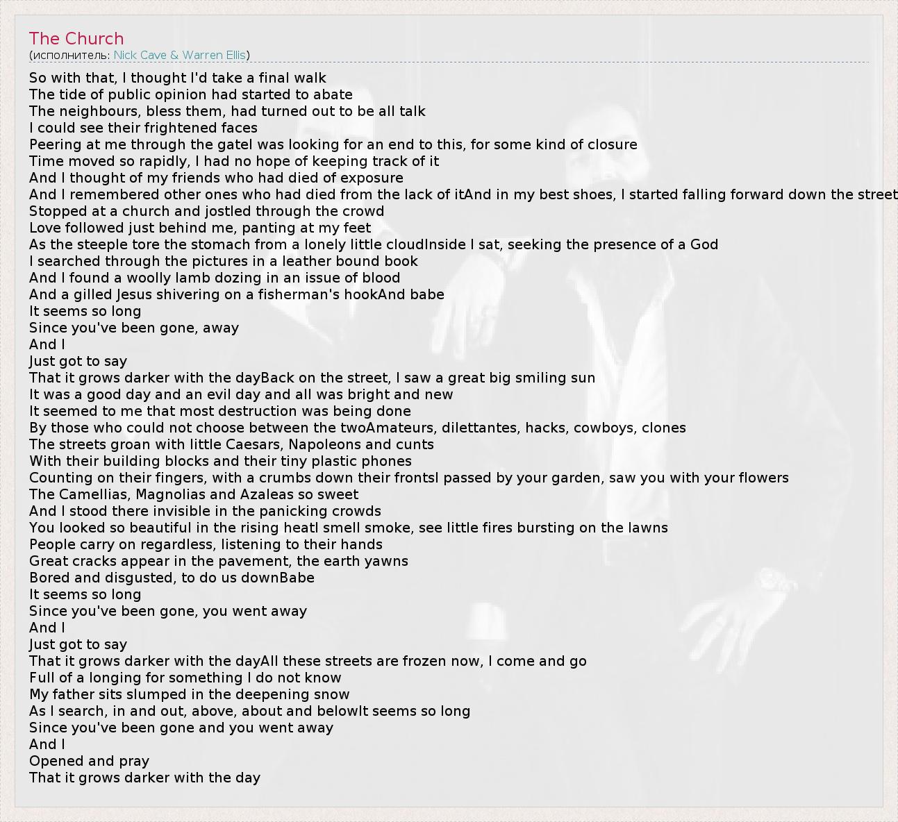 Это интересно:Ник Кейв (Nick Cave) и его партнер по "The Bad Seeds", "Grinderman" и "The Dirty Three" Уоррен Эллис (Warren Ellis) сотрудничают уже более 15 лет. На их счету саундтреки к фильмам "Предложение" (The Proposition 2005), "Как трусливый Роберт Форд убил Джесси Джеймса" (The Assassination of Jesse James by the Coward Robert Ford 2007) и "Дорога" (The Road 2009). 21 сентября 2009 был выпущен двухдисковый альбом "White Lunar", содержащий совместные... продолжение