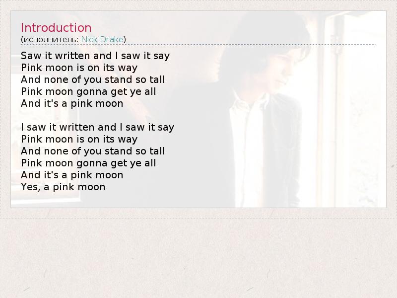 Saw it written and I saw it say Pink moon is on its way And none of you stand so tall Pink moon gonna get ye all And it's a pink moon I saw it written and I saw it say Pink moon is on its way And none of you stand so tall Pink moon gonna get ye all And it's a pink moon Yes, a pink moon