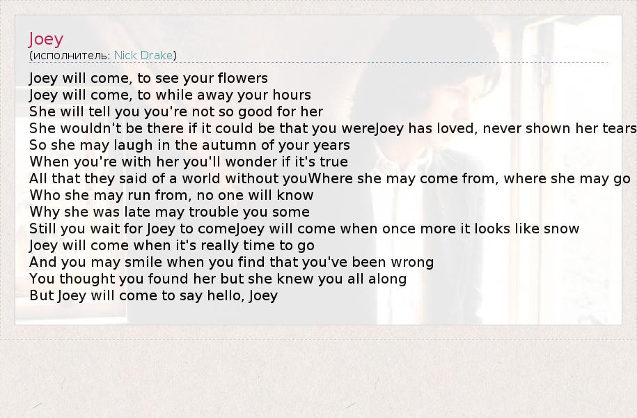 Still you wait for Joey to comeJoey will come when once more it looks like snow