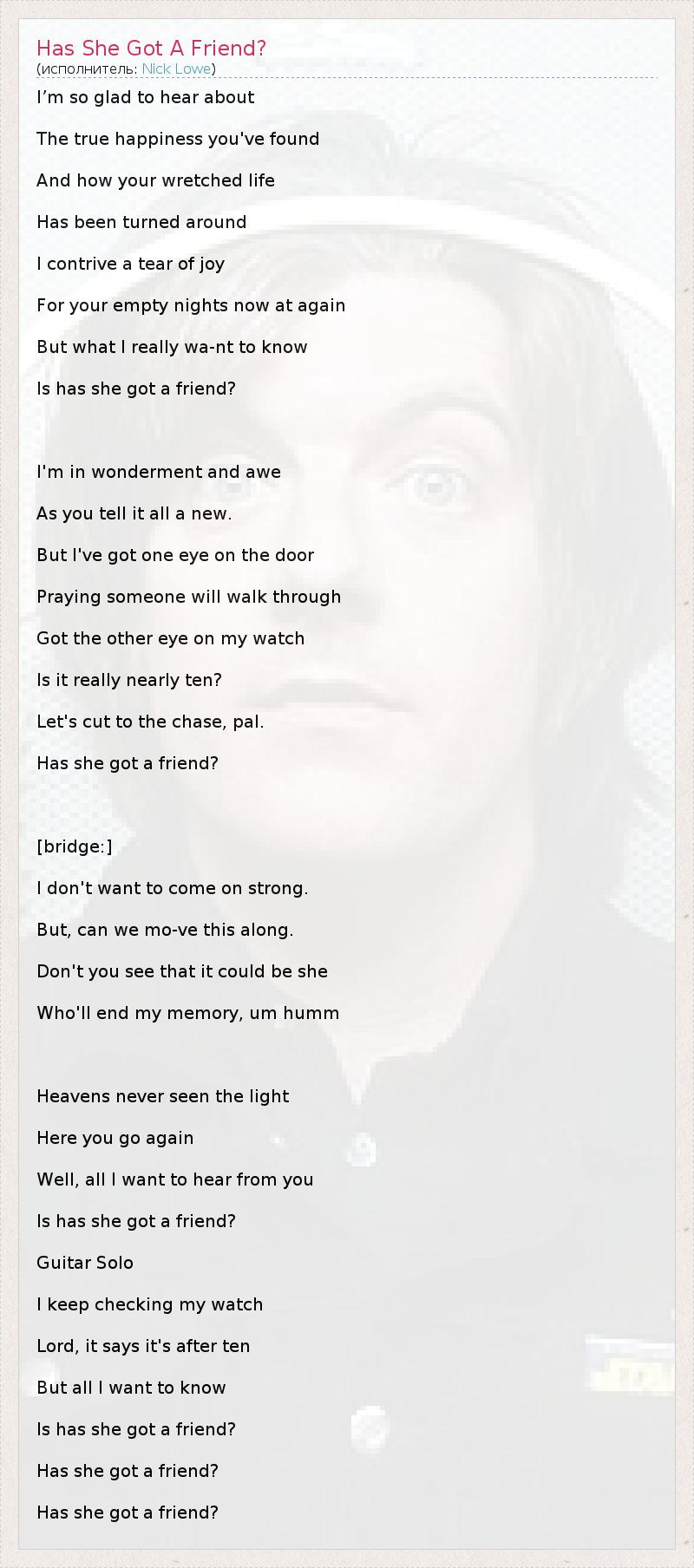ГлавнаяИсполнителиNick LoweHas She Got A Friend?