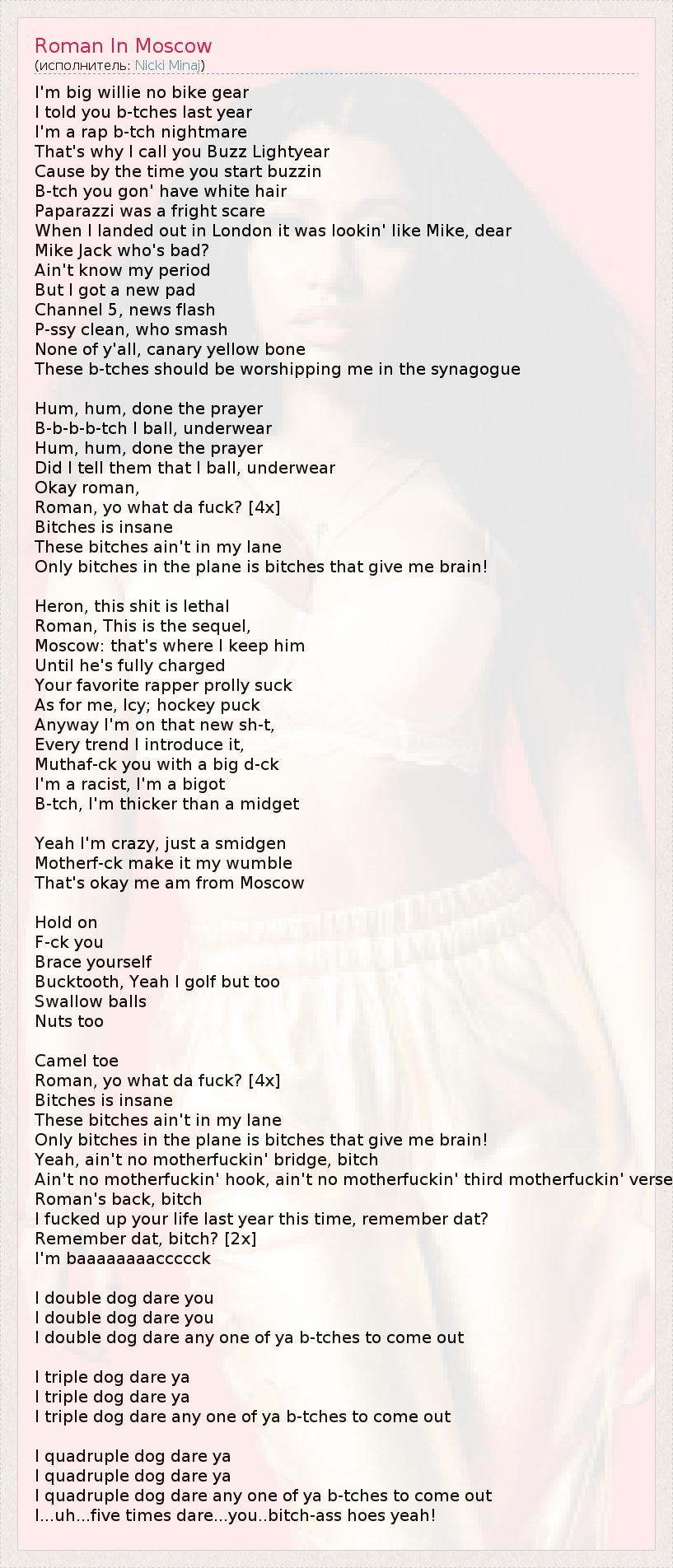 Это интересно:О́ника Та́ня Ма́раж (англ. Onika Tanya Maraj), более известная как Ни́ки Мина́ж (англ. Nicki Minaj; род. 8 декабря 1982, Порт-оф-Спейн, Тринидад и Тобаго) — самая успешная и влиятельная американская рэперша, автор-исполнитель и актриса. Заметил талант молодой девушки Лил Уэйн, который, услышав микстейпы Playtime Is Over, Sucka Free и Beam Me Up Scotty заключил с ней контракт от имени своего лейбла Young Money Entertainment в августе 2009... продолжение