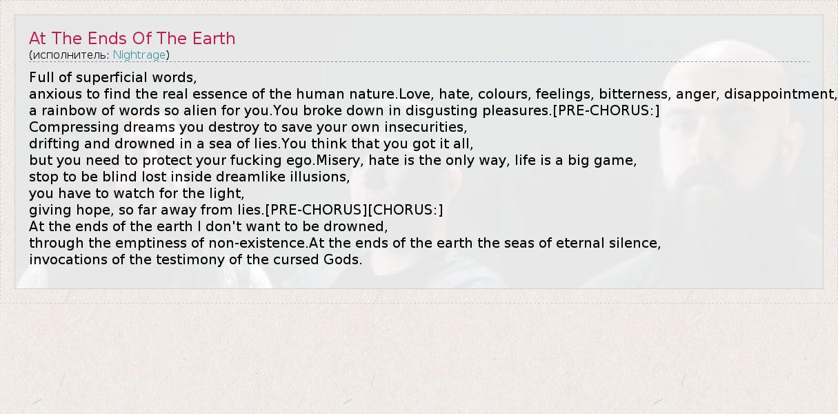 Full of superficial words, anxious to find the real essence of the human nature.Love, hate, colours, feelings, bitterness, anger, disappointment, a rainbow of words so alien for you.You broke down in disgusting pleasures.[PRE-CHORUS:] Compressing dreams you destroy to save your own insecurities, drifting and drowned in a sea of lies.You think that you got it all, but you need to protect your fucking ego.Misery, hate is the only way, life is a big game, stop to be blind lost inside dreamlike illusions, you have to watch for the light, giving hope, so far away from lies.[PRE-CHORUS][CHORUS:] At the ends of the earth I don't want to be drowned, through the emptiness of non-existence.At the ends of the earth the seas of eternal silence, invocations of the testimony of the cursed Gods.