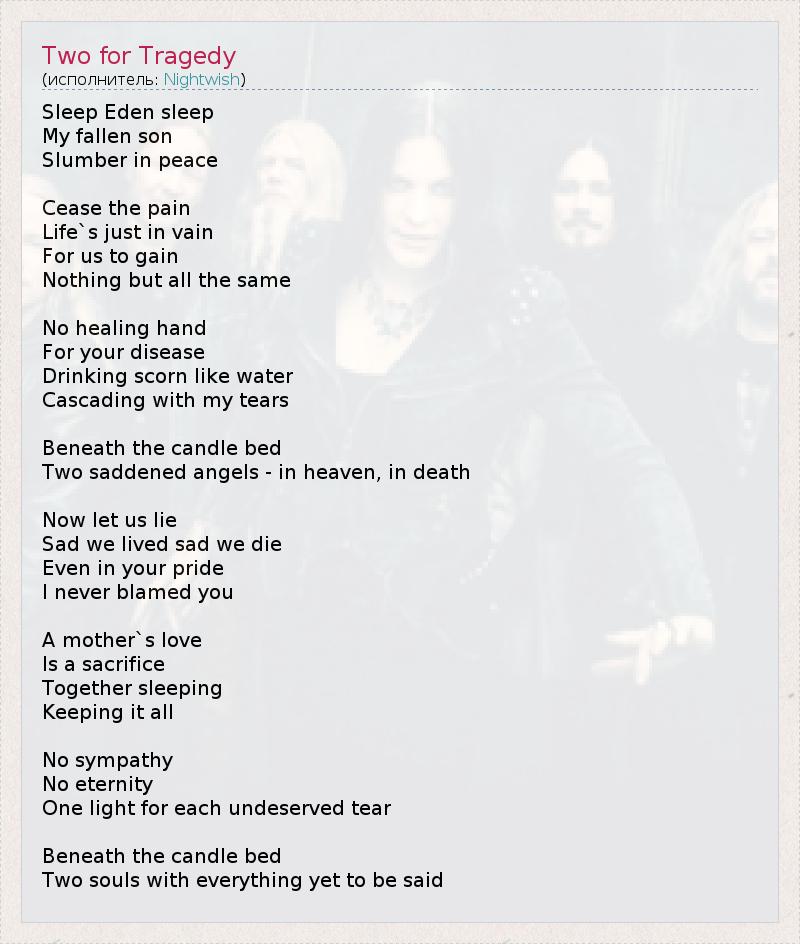 Sleep Eden sleep My fallen son Slumber in peace Cease the pain Life`s just in vain For us to gain Nothing but all the same No healing hand For your disease Drinking scorn like water Cascading with my tears Beneath the candle bed Two saddened angels - in heaven, in death Now let us lie Sad we lived sad we die Even in your pride I never blamed you A mother`s love Is a sacrifice Together sleeping Keeping it all No sympathy No eternity One light for each undeserved tear Beneath the candle bed Two souls with everything yet to be said