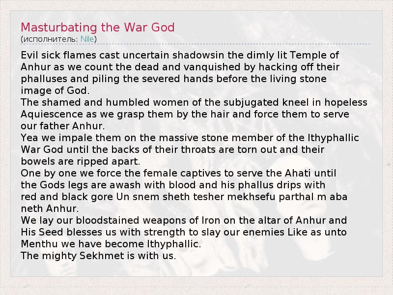 Evil sick flames cast uncertain shadowsin the dimly lit Temple of Anhur as we count the dead and vanquished by hacking off their phalluses and piling the severed hands before the living stone image of God. The shamed and humbled women of the subjugated kneel in hopeless Aquiescence as we grasp them by the hair and force them to serve our father Anhur. Yea we impale them on the massive stone member of the Ithyphallic War God until the backs of their throats are torn out and their bowels are ripped apart. One by one we force the female captives to serve the Ahati until the Gods legs are awash with blood and his phallus drips with red and black gore Un snem sheth tesher mekhsefu parthal m aba neth Anhur. We lay our bloodstained weapons of Iron on the altar of Anhur and His Seed blesses us with strength to slay our enemies Like as unto Menthu we have become Ithyphallic. The mighty Sekhmet is with us.