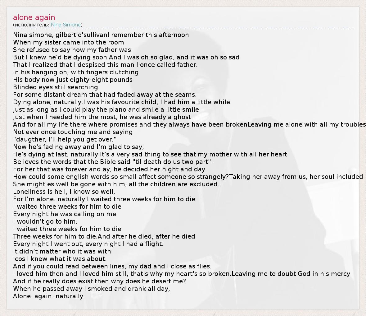 Nina simone, gilbert o'sullivanI remember this afternoon When my sister came into the room She refused to say how my father was But I knew he'd be dying soon.And I was oh so glad, and it was oh so sad That I realized that I despised this man I once called father. In his hanging on, with fingers clutching His body now just eighty-eight pounds Blinded eyes still searching For some distant dream that had faded away at the seams. Dying alone, naturally.I was his favourite child, I had him a little while Just as long as I could play the piano and smile a little smile Just when I needed him the most, he was already a ghost And for all my life there where promises and they always have been brokenLeaving me alone with all my troubles Not ever once touching me and saying "daugther, I'll help you get over." Now he's fading away and I'm glad to say, He's dying at last. naturally.It's a very sad thing to see that my mother with all her heart Believes the words that the Bible said "til death do us two part". For her that was forever and ay, he decided her night and day How could some english words so small affect someone so strangely?Taking her away from us, her soul included She might es well be gone with him, all the children are excluded. Loneliness is hell, I know so well, For I'm alone. naturally.I waited three weeks for him to die I waited three weeks for him to die Every night he was calling on me I wouldn't go to him. I waited three weeks for him to die Three weeks for him to die.And after he died, after he died Every night I went out, every night I had a flight. It didn't matter who it was with 'cos I knew what it was about. And if you could read between lines, my dad and I close as flies. I loved him then and I loved him still, that's why my heart's so broken.Leaving me to doubt God in his mercy And if he really does exist then why does he desert me? When he passed away I smoked and drank all day, Alone. again. naturally.