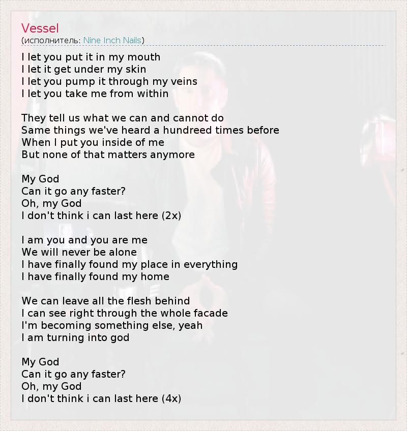 I let you put it in my mouth I let it get under my skin I let you pump it through my veins I let you take me from within They tell us what we can and cannot do Same things we've heard a hundreed times before When I put you inside of me But none of that matters anymore My God Can it go any faster? Oh, my God I don't think i can last here (2x) I am you and you are me We will never be alone I have finally found my place in everything I have finally found my home We can leave all the flesh behind I can see right through the whole facade I'm becoming something else, yeah I am turning into god My God Can it go any faster? Oh, my God I don't think i can last here (4x)