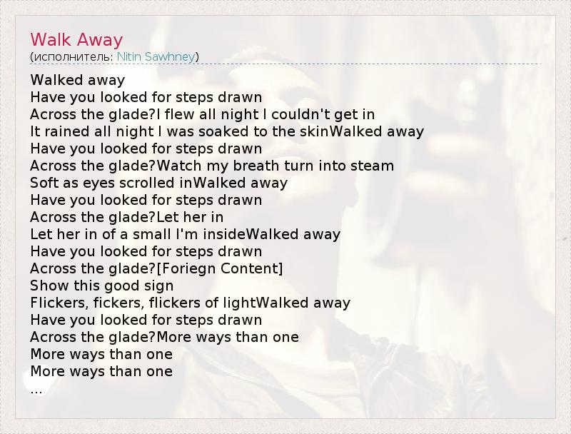 Walked away Have you looked for steps drawn Across the glade?I flew all night I couldn't get in It rained all night I was soaked to the skinWalked away Have you looked for steps drawn Across the glade?Watch my breath turn into steam Soft as eyes scrolled inWalked away Have you looked for steps drawn Across the glade?Let her in Let her in of a small I'm insideWalked away Have you looked for steps drawn Across the glade?[Foriegn Content] Show this good sign Flickers, fickers, flickers of lightWalked away Have you looked for steps drawn Across the glade?More ways than one More ways than one More ways than one ...