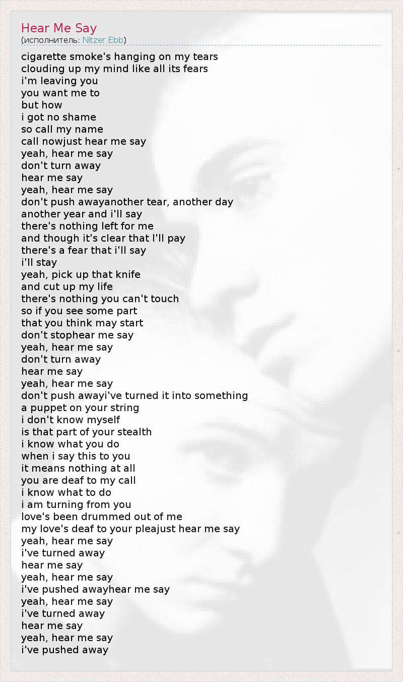 cigarette smoke's hanging on my tears clouding up my mind like all its fears i'm leaving you you want me to but how i got no shame so call my name call nowjust hear me say yeah, hear me say don't turn away hear me say yeah, hear me say don't push awayanother tear, another day another year and i'll say there's nothing left for me and though it's clear that I'll pay there's a fear that i'll say i'll stay yeah, pick up that knife and cut up my life there's nothing you can't touch so if you see some part that you think may start don't stophear me say yeah, hear me say don't turn away hear me say yeah, hear me say don't push awayi've turned it into something a puppet on your string i don't know myself is that part of your stealth i know what you do when i say this to you it means nothing at all you are deaf to my call i know what to do i am turning from you love's been drummed out of me my love's deaf to your pleajust hear me say yeah, hear me say i've turned away hear me say yeah, hear me say i've pushed awayhear me say yeah, hear me say i've turned away hear me say yeah, hear me say i've pushed away
