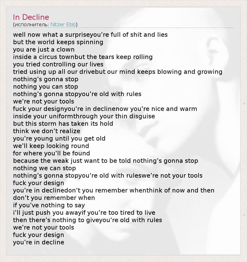 well now what a surpriseyou're full of shit and lies but the world keeps spinning you are just a clown inside a circus townbut the tears keep rolling you tried controlling our lives tried using up all our drivebut our mind keeps blowing and growing nothing's gonna stop nothing you can stop nothing's gonna stopyou're old with rules we're not your tools fuck your designyou're in declinenow you're nice and warm inside your uniformthrough your thin disguise but this storm has taken its hold think we don't realize you're young until you get old we'll keep looking round for where you'll be found because the weak just want to be told nothing's gonna stop nothing we can stop nothing's gonna stopyou're old with ruleswe're not your tools fuck your design you're in declinedon't you remember whenthink of now and then don't you remember when if you've nothing to say i'll just push you awayif you're too tired to live then there's nothing to giveyou're old with rules we're not your tools fuck your design you're in decline