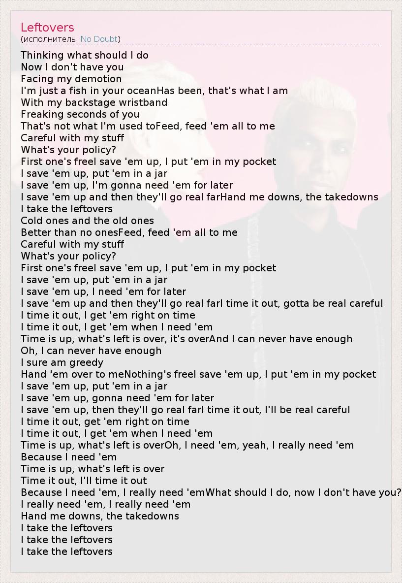 Thinking what should I do Now I don't have you Facing my demotion I'm just a fish in your oceanHas been, that's what I am With my backstage wristband Freaking seconds of you That's not what I'm used toFeed, feed 'em all to me Careful with my stuff What's your policy? First one's freeI save 'em up, I put 'em in my pocket I save 'em up, put 'em in a jar I save 'em up, I'm gonna need 'em for later I save 'em up and then they'll go real farHand me downs, the takedowns I take the leftovers Cold ones and the old ones Better than no onesFeed, feed 'em all to me Careful with my stuff What's your policy? First one's freeI save 'em up, I put 'em in my pocket I save 'em up, put 'em in a jar I save 'em up, I need 'em for later I save 'em up and then they'll go real farI time it out, gotta be real careful I time it out, I get 'em right on time I time it out, I get 'em when I need 'em Time is up, what's left is over, it's overAnd I can never have enough Oh, I can never have enough I sure am greedy Hand 'em over to meNothing's freeI save 'em up, I put 'em in my pocket I save 'em up, put 'em in a jar I save 'em up, gonna need 'em for later I save 'em up, then they'll go real farI time it out, I'll be real careful I time it out, get 'em right on time I time it out, I get 'em when I need 'em Time is up, what's left is overOh, I need 'em, yeah, I really need 'em Because I need 'em Time is up, what's left is over Time it out, I'll time it out Because I need 'em, I really need 'emWhat should I do, now I don't have you? I really need 'em, I really need 'em Hand me downs, the takedowns I take the leftovers I take the leftovers I take the leftovers