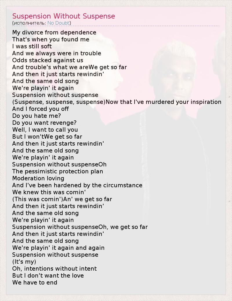 My divorce from dependence That's when you found me I was still soft And we always were in trouble Odds stacked against us And trouble's what we areWe get so far And then it just starts rewindin' And the same old song We're playin' it again Suspension without suspense (Suspense, suspense, suspense)Now that I've murdered your inspiration And I forced you off Do you hate me? Do you want revenge? Well, I want to call you But I won'tWe get so far And then it just starts rewindin' And the same old song We're playin' it again Suspension without suspenseOh The pessimistic protection plan Moderation loving And I've been hardened by the circumstance We knew this was comin' (This was comin')An' we get so far And then it just starts rewindin' And the same old song We're playin' it again Suspension without suspenseOh, we get so far And then it just starts rewindin' And the same old song We're playin' it again and again Suspension without suspense (It's my) Oh, intentions without intent But I don't want the love We have to end