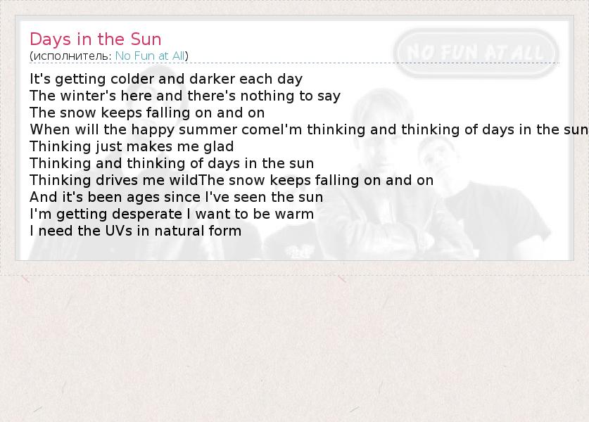 It's getting colder and darker each day The winter's here and there's nothing to say The snow keeps falling on and on When will the happy summer comeI'm thinking and thinking of days in the sun Thinking just makes me glad Thinking and thinking of days in the sun Thinking drives me wildThe snow keeps falling on and on And it's been ages since I've seen the sun I'm getting desperate I want to be warm I need the UVs in natural form