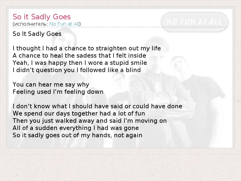 So It Sadly Goes I thought I had a chance to straighten out my life A chance to heal the sadess that I felt inside Yeah, I was happy then I wore a stupid smile I didn't question you I followed like a blind You can hear me say why Feeling used I'm feeling down I don't know what I should have said or could have done We spend our days together had a lot of fun Then you just walked away and said I'm moving on All of a sudden everything I had was gone So it sadly goes out of my hands, not again