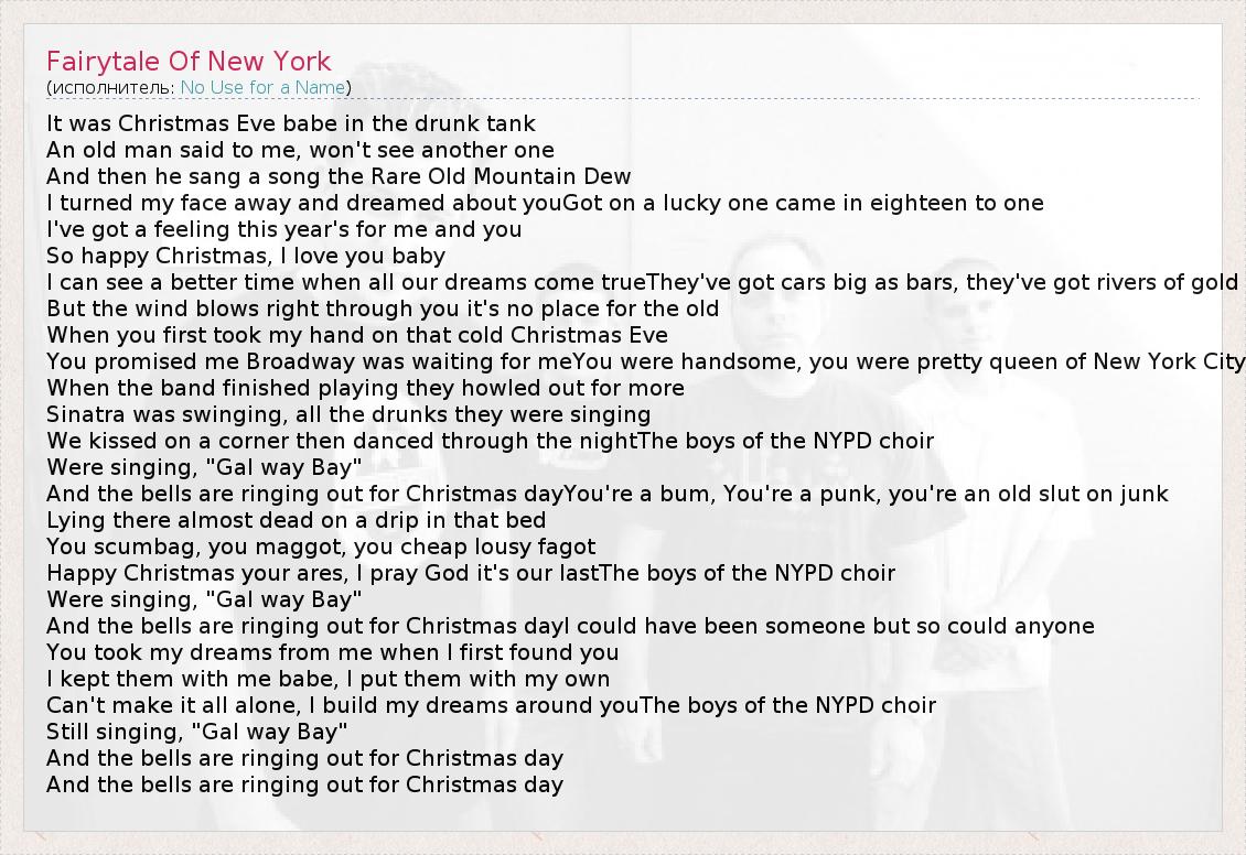 It was Christmas Eve babe in the drunk tank An old man said to me, won't see another one And then he sang a song the Rare Old Mountain Dew I turned my face away and dreamed about youGot on a lucky one came in eighteen to one I've got a feeling this year's for me and you So happy Christmas, I love you baby I can see a better time when all our dreams come trueThey've got cars big as bars, they've got rivers of gold But the wind blows right through you it's no place for the old When you first took my hand on that cold Christmas Eve You promised me Broadway was waiting for meYou were handsome, you were pretty queen of New York City When the band finished playing they howled out for more Sinatra was swinging, all the drunks they were singing We kissed on a corner then danced through the nightThe boys of the NYPD choir Were singing, "Gal way Bay" And the bells are ringing out for Christmas dayYou're a bum, You're a punk, you're an old slut on junk Lying there almost dead on a drip in that bed You scumbag, you maggot, you cheap lousy fagot Happy Christmas your ares, I pray God it's our lastThe boys of the NYPD choir Were singing, "Gal way Bay" And the bells are ringing out for Christmas dayI could have been someone but so could anyone You took my dreams from me when I first found you I kept them with me babe, I put them with my own Can't make it all alone, I build my dreams around youThe boys of the NYPD choir Still singing, "Gal way Bay" And the bells are ringing out for Christmas day And the bells are ringing out for Christmas day