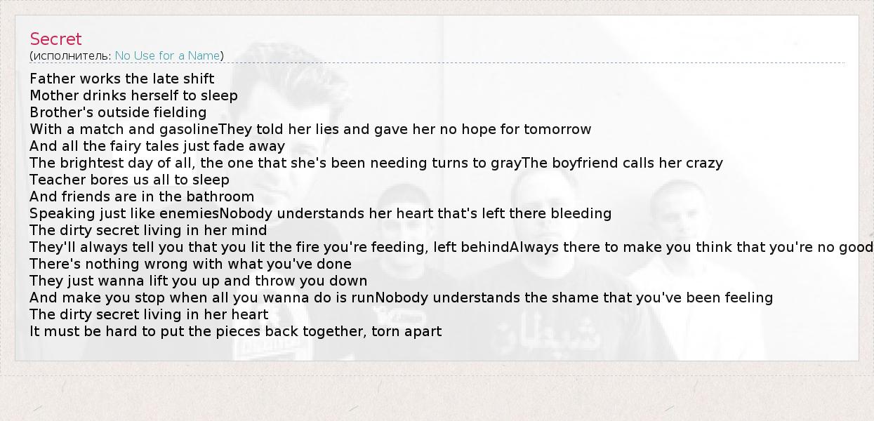 Это интересно:No Use for a Name (или просто NUFAN) панк-рокеры родом из Сан Хосе, Калифорния. В первоначальном составе, образованном в 1987 году, были Tony Sly, Steve Papoutsis, Rory Koff, и Chris Dodge. Звучание группы менялось на протяжении всего карьерного времени, становясь более мягким и популярным звучанием мелодичного панка.Первый релиз группы "Gang Way "состоялся на сборнике Maximum RocknRoll's 1987 Turn it Around. Через год группы выпустал... продолжение
