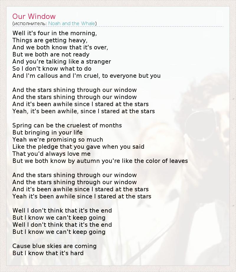 Сейчас четыре утра, Всё становится тяжелее. И знаем мы оба, что уже все кончено, Но оба мы еще не готовы И говоришь ты как незнакомец, А я не знаю что делать, Для всех кроме тебя я черств и жесток. И светят звезды сквозь наше окно, И светят звезды сквозь наше окно, Но недолго я смотрел на них Да, недолго я смотрел на них. Весна может быть самой жестокой порой, Хотя многое нам приносит. И мы так много обещали друг другу Как и залог, что дала ты мне, сказав: "Буду всегда любить тебя." Но мы ведь знаем, к осени ты вся цвета листьев. И светят звезды сквозь наше окно, И светят звезды сквозь наше окно, Но недолго я смотрел на них Да, недолго я смотрел на них. Я не думаю, что это конец, Но знаю, мы не можем так дальше продолжать. Я не думаю, что это конец, Но знаю, мы не можем так дальше продолжать. И все же голубые небеса на подходе, Правда я знаю, что это трудно.