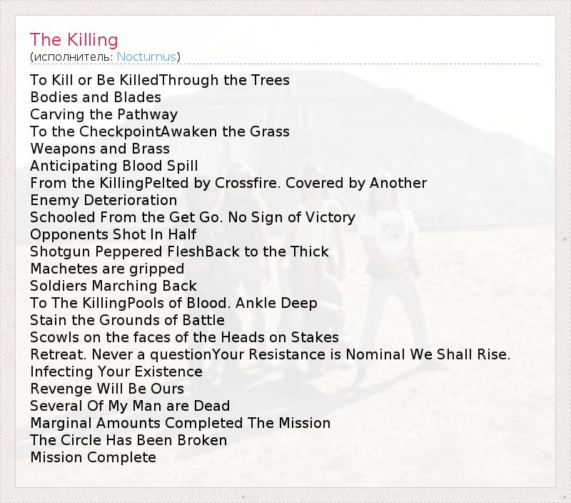 To Kill or Be KilledThrough the Trees Bodies and Blades Carving the Pathway To the CheckpointAwaken the Grass Weapons and Brass Anticipating Blood Spill From the KillingPelted by Crossfire. Covered by Another Enemy Deterioration Schooled From the Get Go. No Sign of Victory Opponents Shot In Half Shotgun Peppered FleshBack to the Thick Machetes are gripped Soldiers Marching Back To The KillingPools of Blood. Ankle Deep Stain the Grounds of Battle Scowls on the faces of the Heads on Stakes Retreat. Never a questionYour Resistance is Nominal We Shall Rise. Infecting Your Existence Revenge Will Be Ours Several Of My Man are Dead Marginal Amounts Completed The Mission The Circle Has Been Broken Mission Complete