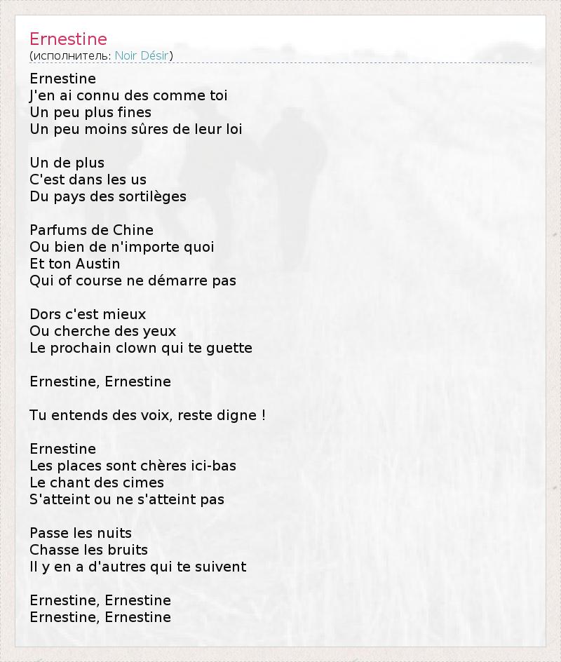 Эрнестин, Я знал таких, как ты, Немного тоньше, Немного менее уверенные в своих правах. К тому же Это в обычаях Чарующей страны. Аромат Китая, Или даже не важно откуда, И твой Остен, 1 Который, конечно, не заводится. Лучше ложись спать, Или поищи Следующего клоуна, который тебя ждет. Эрнестин, Эрнестин, Ты слышишь голоса, достойно! Эрнестин, Здесь внизу места дорогие, Высшая песня Достигается или нет. Ночи проходят, Раздается шум, Найдутся и другие, кто последует за тобой. Эрнестин, Эрнестин, Эрнестин, Эрнестин. 1 - Британская марка автомобиля, закончившая свое существование в 1988 году