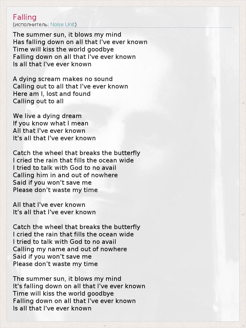 От летнего солнца у меня срывает крышу, Его лучи опаляют всё, что я знаю. Время поцелует этот мир на прощание. Крушение всего, что я когда-либо знал, - Это единственное, что мне довелось узнать.... Крик умирающего безмолвен, Взывая ко всему, что я когда-либо знал. Вот и я - я потерялся и нашёлся, Взывая ко всему... Мы живём умирающей мечтой, Если ты понимаешь, о чём я. Всё, что я когда-либо знал, Это всё, что я когда-либо знал... Останови колесо, что треплет бабочку. Я плакал дождём, что наполнил океан от края до края, Я пытался говорить с Богом, но бестолку, Взывая к нему в никуда... Я сказал, что если Он не спасёт меня, То пусть будет добр не тратить моё время впустую... Всё, что я когда-либо знал, Это всё, что я когда-либо знал... Останови колесо, что треплет бабочку. Я плакал дождём, что наполнил океан от края до края, Я пытался говорить с Богом, но бестолку, Взывая к нему в никуда... Я сказал, что если Он не спасёт меня, То пусть будет добр не тратить моё время впустую... От летнего солнца у меня срывает крышу, Его лучи опаляют всё, что я знаю. Время поцелует этот мир на прощание. Крушение всего, что я когда-либо знал, - Это единственное, что мне довелось узнать....