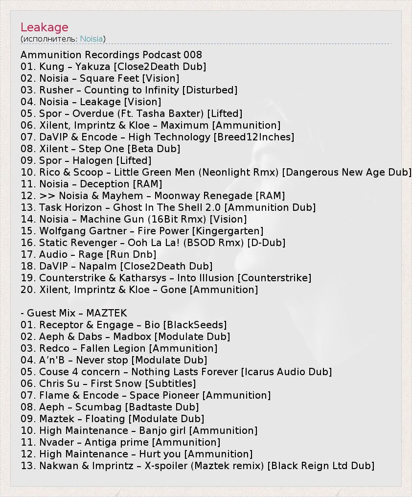 Боеприпасы Записи Подкаст 008 01. Кунг - якудза [Close2Death Dub] 02. Noisia - квадратных футов [Видение] 03. Рушер - Подсчет до бесконечности [Нарушение] 04. Noisia - утечки [Видение] 05. Спор - Просроченные (. Ft Таша Бакстер) [Отменено] 06. Xilent, Imprintz & AMP; KLOE - Максимум [Боеприпасы] 07. Davip & AMP; Кодирование - Высокие технологии [Breed12Inches] 08. Xilent - Шаг [Бета Dub] 09. Спор - Галогенные [Отменено] 10.-Рико и усилитель; Совок - Little Green Men (NeOnlight rmx) [новый опасный Возраст Dub] 11. Noisia - Обман [RAM] 12. & GT; & GT; Noisia & AMP; Mayhem - Moonway Renegade [RAM] 13. Задача Горизонт - Призрак в доспехах 2.0 [боеприпасов Dub] 14. Noisia - Machine Gun (16Bit rmx) [Видение] 15. Wolfgang Gartner - Огневая мощь [Kingergarten] 16. Статический Revenger - Ooh La La! (BSOD rmx) [D-Dub] 17. Аудио - Ярость [Выполнить Днб] 18. Davip - Napalm [Close2Death Dub] 19. Counter-Strike и усилитель; Katharsys - в иллюзию [Counter-Strike] 20. Xilent, Imprintz & AMP; KLOE - Унесенные [Боеприпасы] - Гостевой микс - MAZTEK 01. Рецептор & AMP; Участвовать - Bio [BlackSeeds] 02. Aeph & AMP; Мазки - Madbox [Модулируйте Dub] 03. Redco - Fallen Legion [Боеприпасы] 04. A'n'B - Никогда не прекращайте [Модулируйте Dub] 05. Couse 4 забота - ничто не вечно [Икар Audio Dub] 06. Крис Су - Первый снег [Субтитры] 07. Пламя и усилитель; Кодирование - Космос Pioneer [Боеприпасы] 08. Aeph - Scumbag [Badtaste Dub] 09. Maztek - Плавучий [Модулируйте Dub] 10. Высокая обслуживание - Банджо девушка [Боеприпасы] 11. Nvader - Антига премьер [Боеприпасы] 12. Высокое содержание - тебе больно [Боеприпасы] 13. Nakwan & AMP; Imprintz - X-спойлер (Maztek ремикс) [Черный Reign ООО Dub]