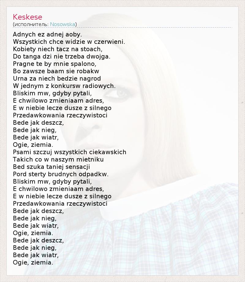 Это интересно:Kasia Nosowska - одна из ведущих польских вокалисток и одна из талантливейших авторов текстов. Как журналист пишет для журналов Filipinka, Muza, Zwierciadło. Изначально Kasia обрела известность в качестве вокалистки группы Hey, но ее сольная карьера не менее интересна. Kasia была удостоена множества наград, в том числе престижной премии польского музыкального рынка Fryderyk в номинациях "Лучшая вокалистка",... продолжение