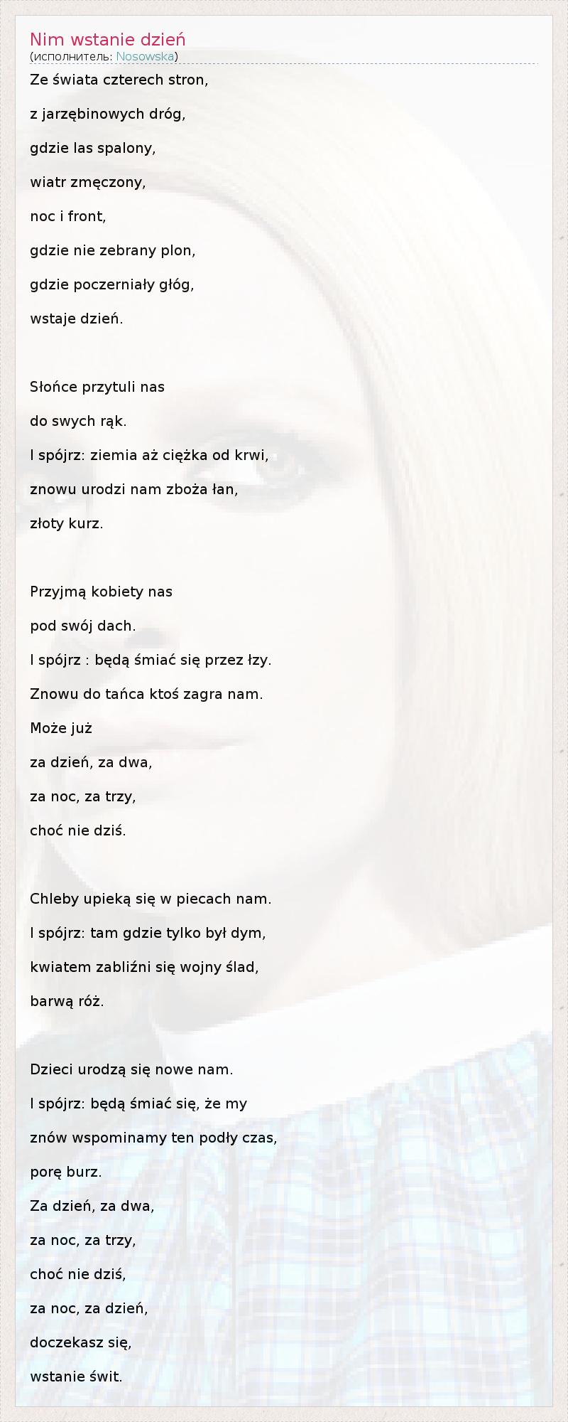 Ze świata czterech stron, z jarzębinowych dróg, gdzie las spalony, wiatr zmęczony, noc i front, gdzie nie zebrany plon, gdzie poczerniały głóg, wstaje dzień. Słońce przytuli nas do swych rąk. I spójrz: ziemia aż ciężka od krwi, znowu urodzi nam zboża łan, złoty kurz. Przyjmą kobiety nas pod swój dach. I spójrz : będą śmiać się przez łzy. Znowu do tańca ktoś zagra nam. Może już za dzień, za dwa, za noc, za trzy, choć nie dziś. Chleby upieką się w piecach nam. I spójrz: tam gdzie tylko był dym, kwiatem zabliźni się wojny ślad, barwą róż. Dzieci urodzą się nowe nam. I spójrz: będą śmiać się, że my znów wspominamy ten podły czas, porę burz. Za dzień, za dwa, za noc, za trzy, choć nie dziś, za noc, za dzień, doczekasz się, wstanie świt.