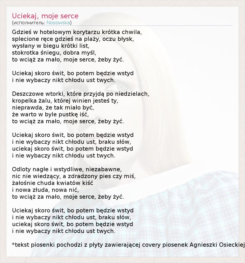 *tekst piosenki pochodzi z płyty zawierającej covery piosenek Agnieszki Osieckiej