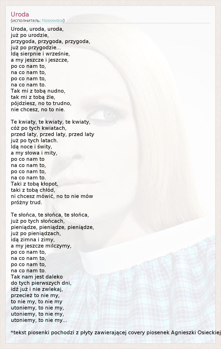 Uroda, uroda, uroda, już po urodzie, przygoda, przygoda, przygoda, już po przygodzie... Idą sierpnie i wrześnie, a my jeszcze i jeszcze, po co nam to, na co nam to, po co nam to, na co nam to. Tak mi z tobą nudno, tak mi z tobą źle, pójdziesz, no to trudno, nie chcesz, no to nie. Te kwiaty, te kwiaty, te kwiaty, cóż po tych kwiatach, przed laty, przed laty, przed laty już po tych latach. Idą noce i świty, a my słowa i mity, po co nam to na co nam to, po co nam to, na co nam to. Taki z tobą kłopot, taki z tobą chłód, ni chcesz mówić, no to nie mów próżny trud. Te słońca, te słońca, te słońca, już po tych słońcach, pieniądze, pieniądze, pieniądze, już po pieniądzach, idą zimna i zimy, a my jeszcze milczymy, po co nam to, na co nam to, po co nam to, na co nam to. Tak nam jest daleko do tych pierwszych dni, idź już i nie zwlekaj, przecież to nie my, to nie my, to nie my utoniemy, to nie my, utoniemy, to nie my, utoniemy, to nie my... *tekst piosenki pochodzi z płyty zawierającej covery piosenek Agnieszki Osieckiej