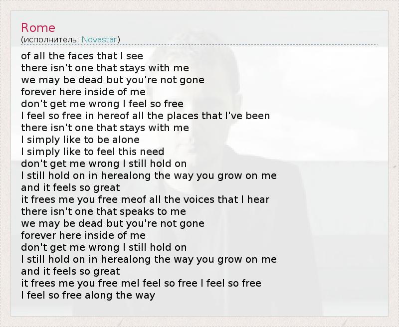 of all the faces that I see there isn't one that stays with me we may be dead but you're not gone forever here inside of me don't get me wrong I feel so free I feel so free in hereof all the places that I've been there isn't one that stays with me I simply like to be alone I simply like to feel this need don't get me wrong I still hold on I still hold on in herealong the way you grow on me and it feels so great it frees me you free meof all the voices that I hear there isn't one that speaks to me we may be dead but you're not gone forever here inside of me don't get me wrong I still hold on I still hold on in herealong the way you grow on me and it feels so great it frees me you free meI feel so free I feel so free I feel so free along the way
