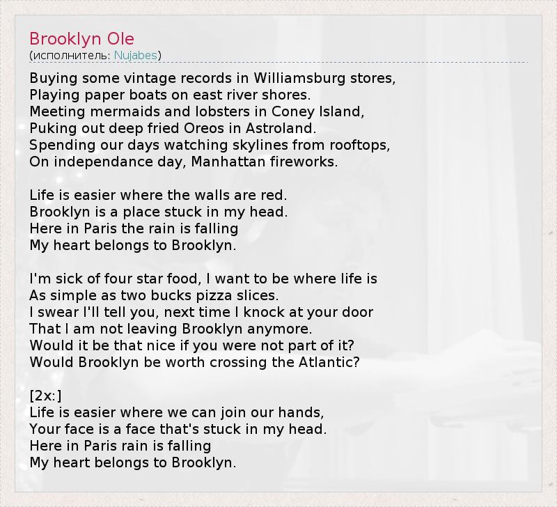 Покупать старые пластинки в магазинах Уильямсберга, 1 Пускать бумажные кораблики с берегов Ист Ривер, 2 Встретить русалок и лобстеров на Кони Айленд. 3 Почувствовать тошноту от жареных во фритюре Орео 4 в Астролэнде, 5 Проводить дни, наблюдая с крыш за линией горизонта, А в День Независимости 6 - за фейерверками Манхэттена. Жизнь кажется проще, когда вокруг тебя стены из красного кирпича, 7 Бруклин - это место, которое навсегда засело у меня в голове. Здесь в Париже, когда идет дождь, Я понимаю, что мое сердце принадлежит Бруклину. Мне надоела высококлассная еда, я хочу оказаться там, где жизнь Проста как кусок пиццы за два доллара. Клянусь, что в следующий раз, когда я постучу в твою дверь, Я скажу тебе, что больше не уеду из Бруклина. Было бы все так же замечательно, если бы ты не была частью этого? Стоил бы тогда Бруклин перелета через всю Атлантику? [2x:] Жизнь становится проще, когда мы с тобой можем взяться за руки, Твое лицо не выходит у меня из головы. Здесь в Париже, когда идет дождь, Я понимаю, что мое сердце принадлежит Бруклину. 1 - район в Бруклине, важный центр инди-рок и хипстерской культур 2 - судоходный пролив длиной 26 км., отделяющий Манхэттен и Бронкс от Бруклина и Квинса 3 - полуостров в южной оконечности Бруклина, здесь расположены знаменитый парк аттракционов и Нью-Йоркский аквариум 4 - круглое небольшое печенье-сэндвич, в Америке считается "королем печенья". Классический вариант - черно-белый: 2 шоколадных печенья скреплены сливочным кремом 5 - парк аттракционов в Бруклине, существовавший с 1962 по 2008 года, в 2010 на его месте открылся парк аттракционов "Луна Парк" 6 - отмечается 4 июля 7 - в Бруклине много зданий, построенных из красного кирпича