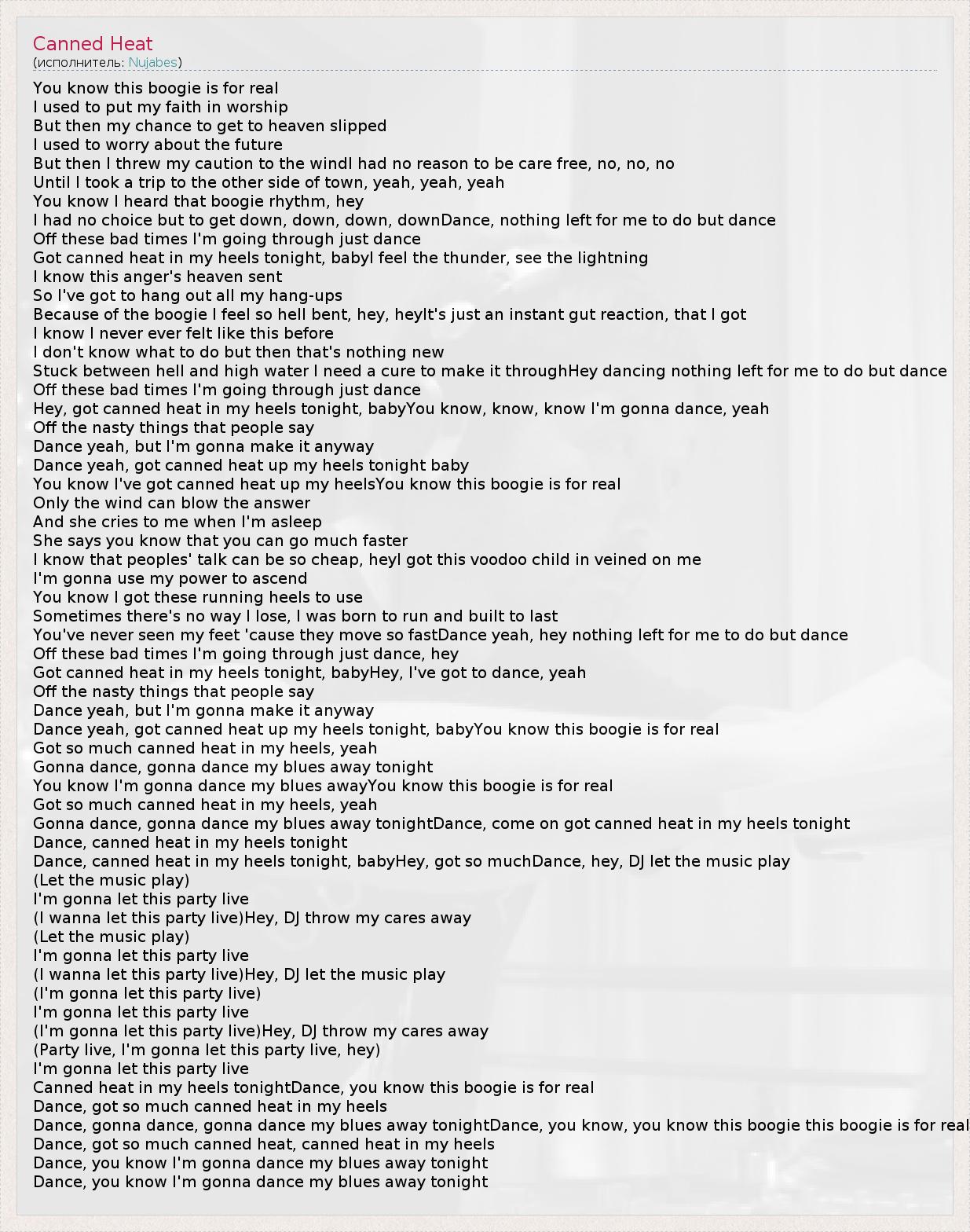 Canned heat in my heels tonightDance, you know this boogie is for real