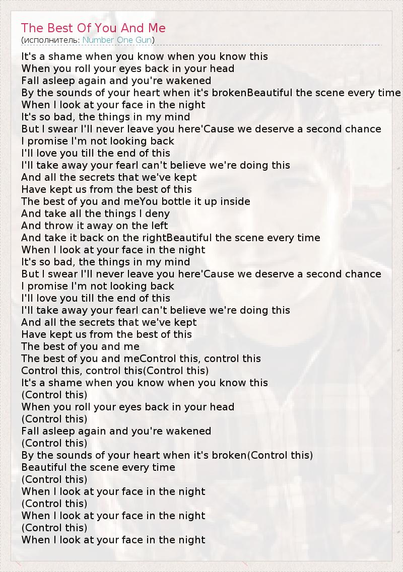 It's a shame when you know when you know this When you roll your eyes back in your head Fall asleep again and you're wakened By the sounds of your heart when it's brokenBeautiful the scene every time When I look at your face in the night It's so bad, the things in my mind But I swear I'll never leave you here'Cause we deserve a second chance I promise I'm not looking back I'll love you till the end of this I'll take away your fearI can't believe we're doing this And all the secrets that we've kept Have kept us from the best of this The best of you and meYou bottle it up inside And take all the things I deny And throw it away on the left And take it back on the rightBeautiful the scene every time When I look at your face in the night It's so bad, the things in my mind But I swear I'll never leave you here'Cause we deserve a second chance I promise I'm not looking back I'll love you till the end of this I'll take away your fearI can't believe we're doing this And all the secrets that we've kept Have kept us from the best of this The best of you and me The best of you and meControl this, control this Control this, control this(Control this) It's a shame when you know when you know this (Control this) When you roll your eyes back in your head (Control this) Fall asleep again and you're wakened (Control this) By the sounds of your heart when it's broken(Control this) Beautiful the scene every time (Control this) When I look at your face in the night (Control this) When I look at your face in the night (Control this) When I look at your face in the night