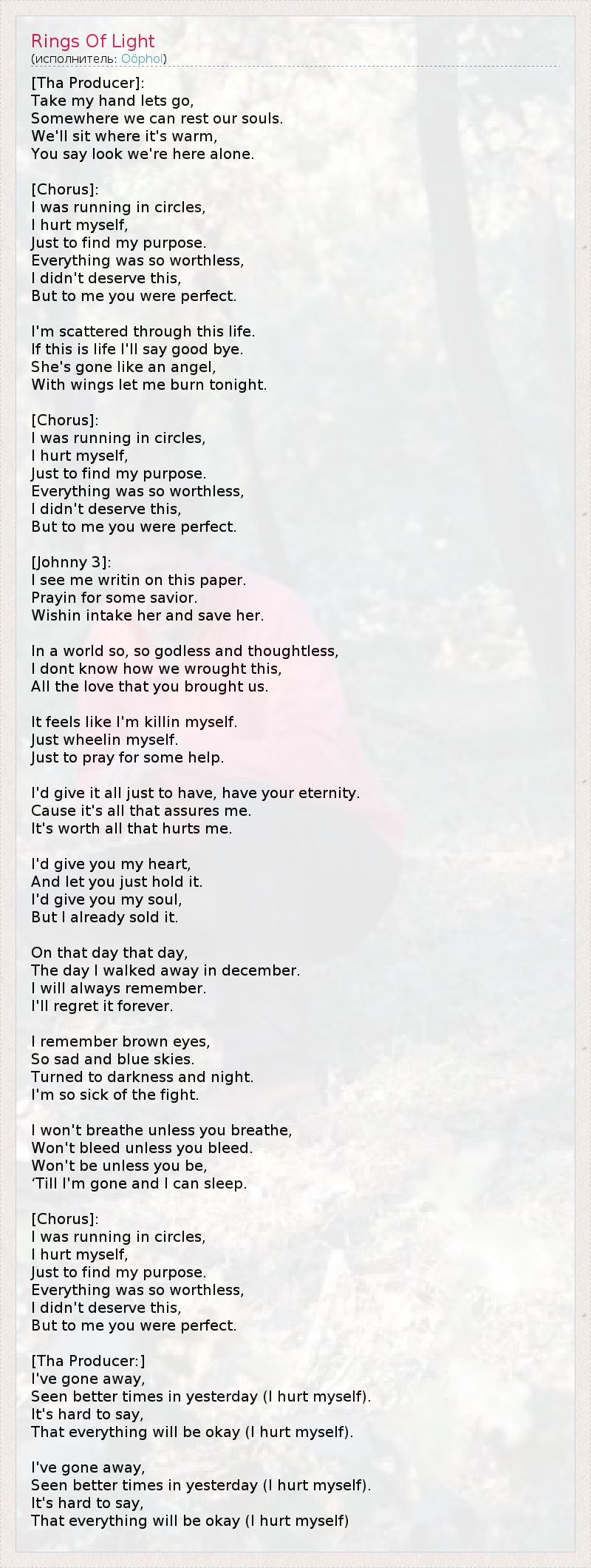 [Tha Producer] Возьми меня за руку, пойдем туда, Где сможем отдохнуть душой. Сядем, где тепло, Ты скажешь: "Посмотри, мы здесь одни". [Припев:] Я носился кругами, Причинял себе боль Лишь бы найти свое предназначение. Все было бесполезно, Я этого не заслужил, Но для меня ты была идеалом... Я растворился в этой жизни. Если это жизнь, то я скажу "прощай". Она исчезла, как ангел На крыльях, позволь мне сгореть этой ночью... [Припев:] Я носился кругами, Причинял себе боль Лишь бы найти свое предназначение. Все было бесполезно, Я этого не заслужил, Но для меня ты была идеалом... [Johnny 3]: Сейчас я пишу на этом листке. Молюсь о спасителе. Хочу принять и спасти ее... В таком мире, безбожном и беспечном, Я не знаю, как мы истерзали ее, - Всю ту любовь, что ты дала нам.... Кажется, будто я себя убиваю, Сам себя колесую, Чтобы молиться о помощи... Я отдал бы всё, лишь бы быть с тобой целую вечность. Это единственное, что меня успокаивает И действительно стоит моих мучений... Я отдал бы тебе своё сердце, Просто чтобы оно было у тебя. Отдал бы душу, Но я уже продал ее. Тот день, Декабрьский день, когда я ушел. Я никогда его не забуду И всегда буду о нем сожалеть. Я помню карие глаза, Такие печальные... и синие небеса, Превратившиеся в темноту и ночь.... Я так устал сражаться.... Я буду бездыханным, пока не задышишь ты, Моя кровь не прольется раньше твоей. Без тебя меня тоже не станет, Лишь когда уйду, я смогу уснуть. [Припев:] Я носился кругами, Причинял себе боль Лишь бы найти свое предназначение. Все было бесполезно, Я этого не заслужил, Но для меня ты была идеалом... [Tha Producer:] Я ушёл, Но я видал лучшие времена (я причиняю себе боль) Тяжело говорить, Что все будет хорошо. (я причиняю себе боль) Я ушёл, Но я видал лучшие времена (я причиняю себе боль) Тяжело говорить, Что все будет хорошо. (я причиняю себе боль)