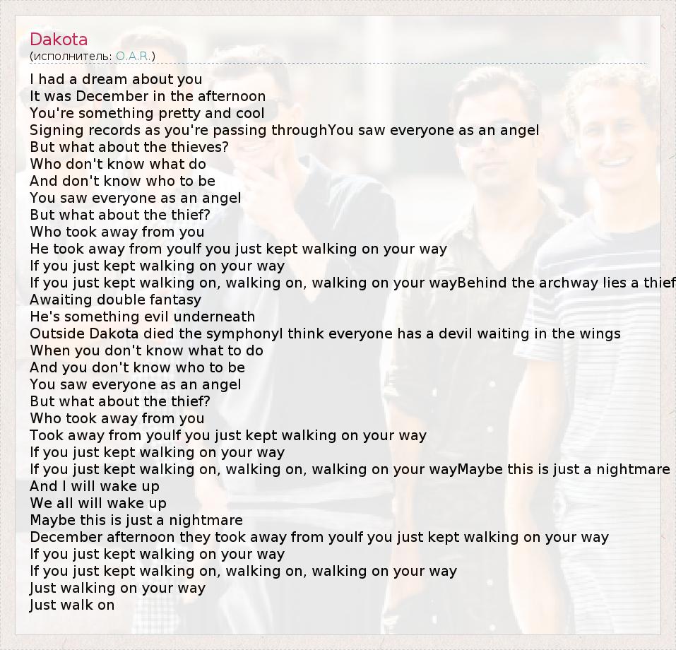 I had a dream about you It was December in the afternoon You're something pretty and cool Signing records as you're passing throughYou saw everyone as an angel But what about the thieves? Who don't know what do And don't know who to be You saw everyone as an angel But what about the thief? Who took away from you He took away from youIf you just kept walking on your way If you just kept walking on your way If you just kept walking on, walking on, walking on your wayBehind the archway lies a thief Awaiting double fantasy He's something evil underneath Outside Dakota died the symphonyI think everyone has a devil waiting in the wings When you don't know what to do And you don't know who to be You saw everyone as an angel But what about the thief? Who took away from you Took away from youIf you just kept walking on your way If you just kept walking on your way If you just kept walking on, walking on, walking on your wayMaybe this is just a nightmare And I will wake up We all will wake up Maybe this is just a nightmare December afternoon they took away from youIf you just kept walking on your way If you just kept walking on your way If you just kept walking on, walking on, walking on your way Just walking on your way Just walk on