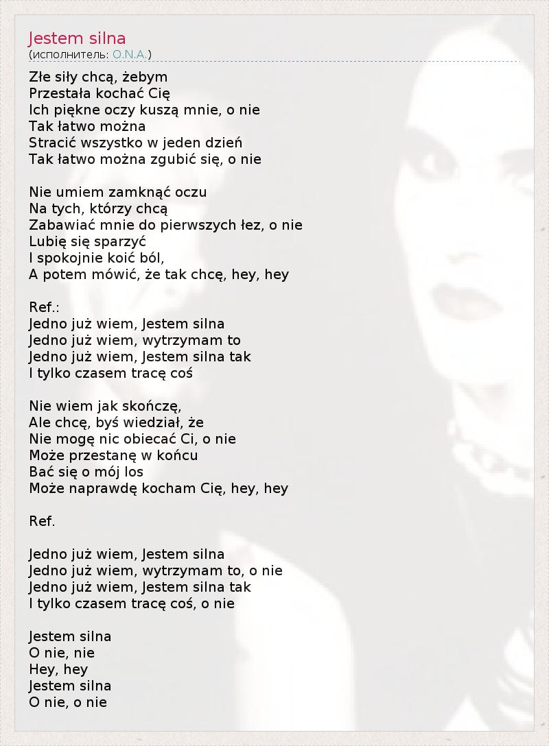 Złe siły chcą, żebym Przestała kochać Cię Ich piękne oczy kuszą mnie, o nie Tak łatwo można Stracić wszystko w jeden dzień Tak łatwo można zgubić się, o nie Nie umiem zamknąć oczu Na tych, którzy chcą Zabawiać mnie do pierwszych łez, o nie Lubię się sparzyć I spokojnie koić ból, A potem mówić, że tak chcę, hey, hey Ref.: Jedno już wiem, Jestem silna Jedno już wiem, wytrzymam to Jedno już wiem, Jestem silna tak I tylko czasem tracę coś Nie wiem jak skończę, Ale chcę, byś wiedział, że Nie mogę nic obiecać Ci, o nie Może przestanę w końcu Bać się o mój los Może naprawdę kocham Cię, hey, hey Ref. Jedno już wiem, Jestem silna Jedno już wiem, wytrzymam to, o nie Jedno już wiem, Jestem silna tak I tylko czasem tracę coś, o nie Jestem silna O nie, nie Hey, hey Jestem silna O nie, o nie