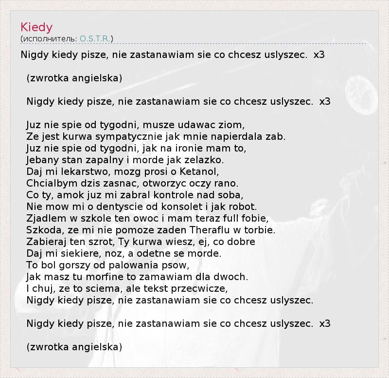 Это интересно:Адам Островски (польск. Adam Ostrowski) — (родился 15 мая, 1980 года в городе Лодзь, Польша), более известный под псевдонимом O.S.T.R. — один из наиболее популярных рэпперов Польши.Наиболее известен своими фристайл навыками. В своих произведениях затрагивает различные темы, начиная от курения марихуаны, заканчивая актуальными общественно-политическими и социальными проблемами.Работал на... продолжение