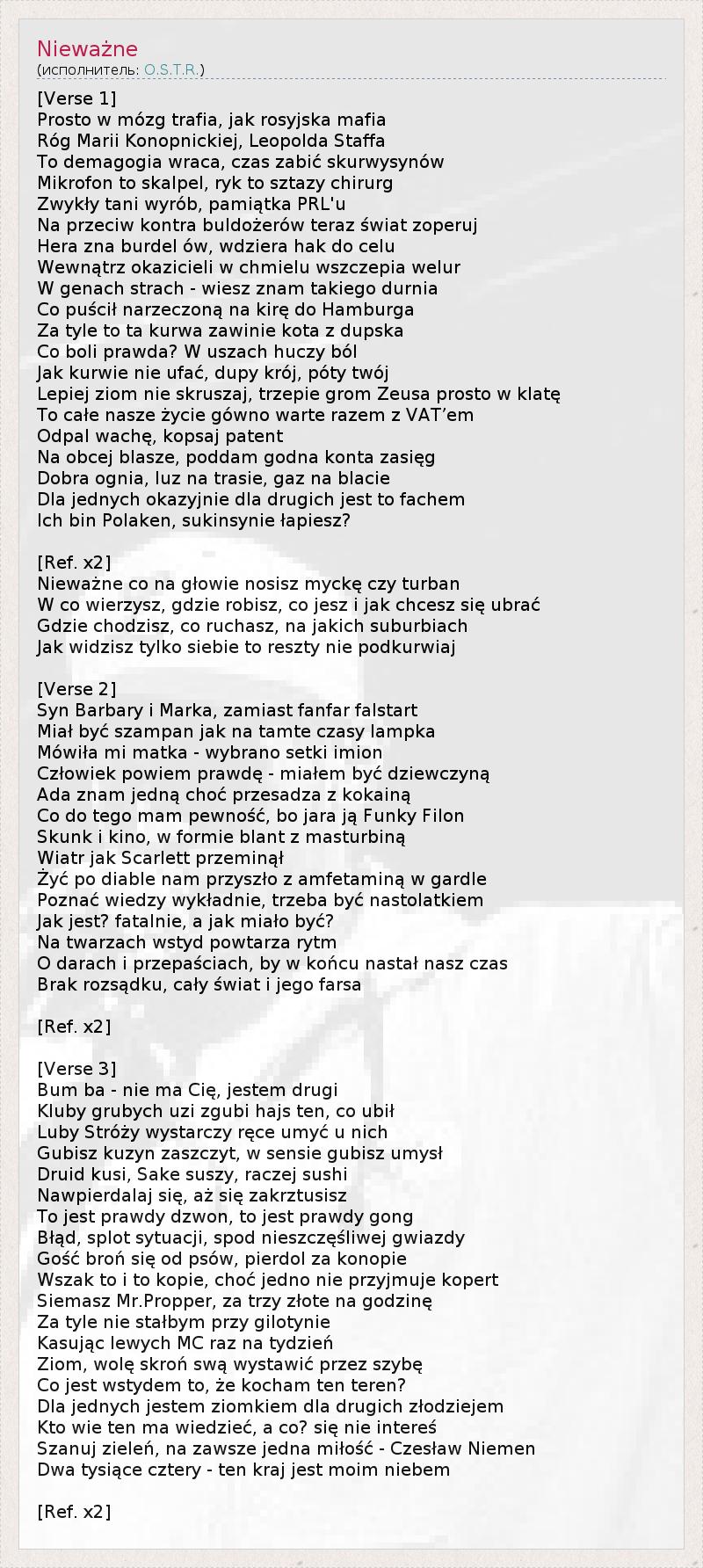 Это интересно:Адам Островски (польск. Adam Ostrowski) — (родился 15 мая, 1980 года в городе Лодзь, Польша), более известный под псевдонимом O.S.T.R. — один из наиболее популярных рэпперов Польши.Наиболее известен своими фристайл навыками. В своих произведениях затрагивает различные темы, начиная от курения марихуаны, заканчивая актуальными общественно-политическими и социальными проблемами.Работал на... продолжение
