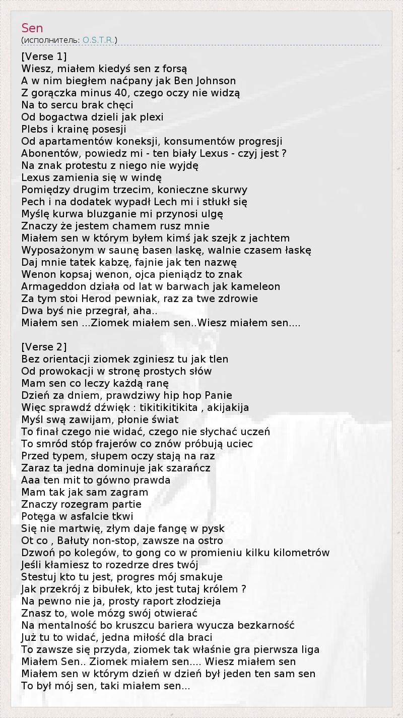 Это интересно:Адам Островски (польск. Adam Ostrowski) — (родился 15 мая, 1980 года в городе Лодзь, Польша), более известный под псевдонимом O.S.T.R. — один из наиболее популярных рэпперов Польши.Наиболее известен своими фристайл навыками. В своих произведениях затрагивает различные темы, начиная от курения марихуаны, заканчивая актуальными общественно-политическими и социальными проблемами.Работал на... продолжение