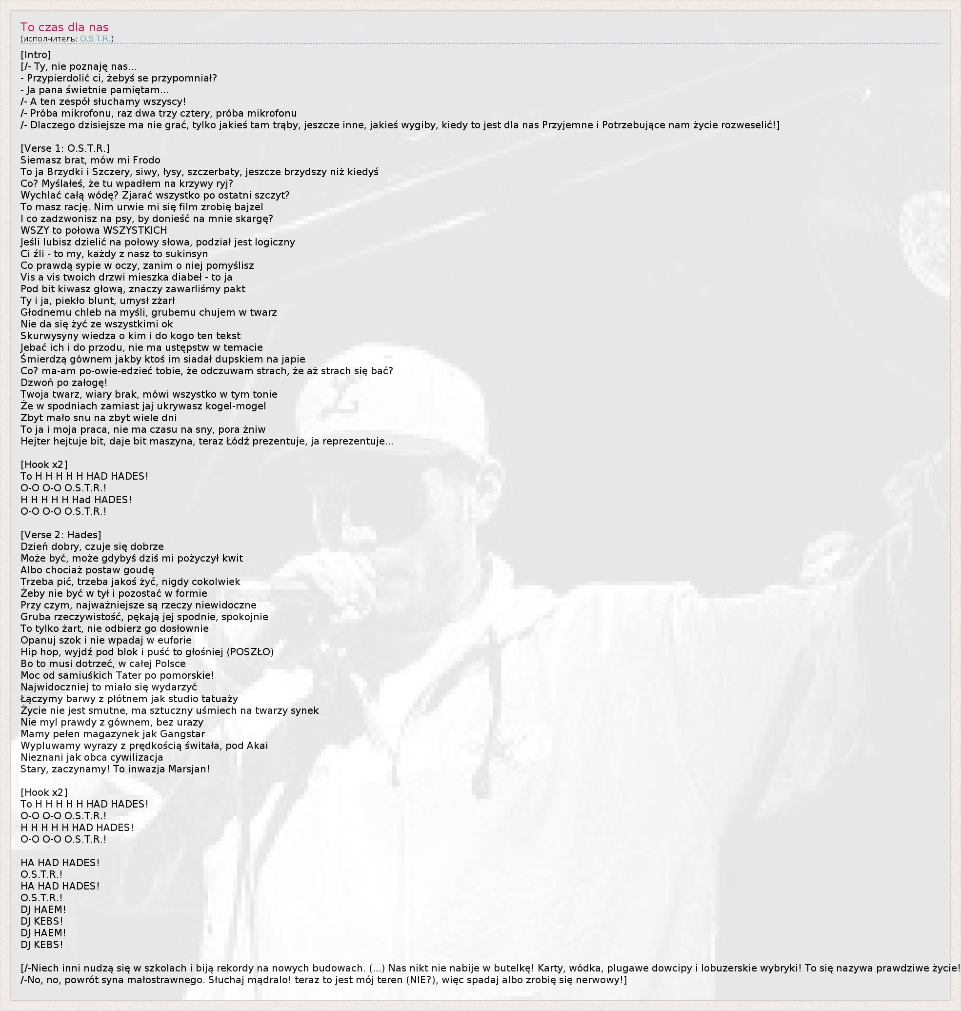 Это интересно:Адам Островски (польск. Adam Ostrowski) — (родился 15 мая, 1980 года в городе Лодзь, Польша), более известный под псевдонимом O.S.T.R. — один из наиболее популярных рэпперов Польши.Наиболее известен своими фристайл навыками. В своих произведениях затрагивает различные темы, начиная от курения марихуаны, заканчивая актуальными общественно-политическими и социальными проблемами.Работал на... продолжение