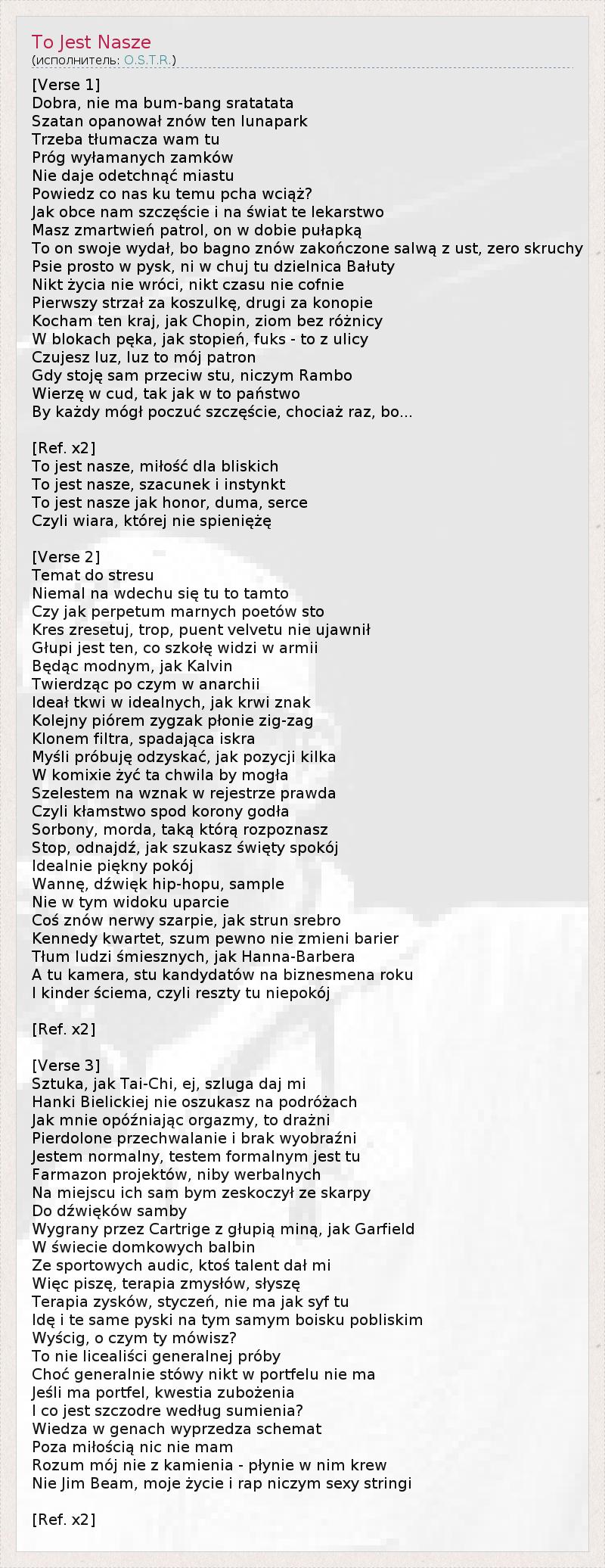 [Verse 1] Dobra, nie ma bum-bang sratatata Szatan opanował znów ten lunapark Trzeba tłumacza wam tu Próg wyłamanych zamków Nie daje odetchnąć miastu Powiedz co nas ku temu pcha wciąż? Jak obce nam szczęście i na świat te lekarstwo Masz zmartwień patrol, on w dobie pułapką To on swoje wydał, bo bagno znów zakończone salwą z ust, zero skruchy Psie prosto w pysk, ni w chuj tu dzielnica Bałuty Nikt życia nie wróci, nikt czasu nie cofnie Pierwszy strzał za koszulkę, drugi za konopie Kocham ten kraj, jak Chopin, ziom bez różnicy W blokach pęka, jak stopień, fuks - to z ulicy Czujesz luz, luz to mój patron Gdy stoję sam przeciw stu, niczym Rambo Wierzę w cud, tak jak w to państwo By każdy mógł poczuć szczęście, chociaż raz, bo... [Ref. x2] To jest nasze, miłość dla bliskich To jest nasze, szacunek i instynkt To jest nasze jak honor, duma, serce Czyli wiara, której nie spieniężę [Verse 2] Temat do stresu Niemal na wdechu się tu to tamto Czy jak perpetum marnych poetów sto Kres zresetuj, trop, puent velvetu nie ujawnił Głupi jest ten, co szkołę widzi w armii Będąc modnym, jak Kalvin Twierdząc po czym w anarchii Ideał tkwi w idealnych, jak krwi znak Kolejny piórem zygzak płonie zig-zag Klonem filtra, spadająca iskra Myśli próbuję odzyskać, jak pozycji kilka W komixie żyć ta chwila by mogła Szelestem na wznak w rejestrze prawda Czyli kłamstwo spod korony godła Sorbony, morda, taką którą rozpoznasz Stop, odnajdź, jak szukasz święty spokój Idealnie piękny pokój Wannę, dźwięk hip-hopu, sample Nie w tym widoku uparcie Coś znów nerwy szarpie, jak strun srebro Kennedy kwartet, szum pewno nie zmieni barier Tłum ludzi śmiesznych, jak Hanna-Barbera A tu kamera, stu kandydatów na biznesmena roku I kinder ściema, czyli reszty tu niepokój [Ref. x2] [Verse 3] Sztuka, jak Tai-Chi, ej, szluga daj mi Hanki Bielickiej nie oszukasz na podróżach Jak mnie opóźniając orgazmy, to drażni Pierdolone przechwalanie i brak wyobraźni Jestem normalny, testem formalnym jest tu Farmazon projektów, niby werbalnych Na miejscu ich sam bym zeskoczył ze skarpy Do dźwięków samby Wygrany przez Cartrige z głupią miną, jak Garfield W świecie domkowych balbin Ze sportowych audic, ktoś talent dał mi Więc piszę, terapia zmysłów, słyszę Terapia zysków, styczeń, nie ma jak syf tu Idę i te same pyski na tym samym boisku pobliskim Wyścig, o czym ty mówisz? To nie licealiści generalnej próby Choć generalnie stówy nikt w portfelu nie ma Jeśli ma portfel, kwestia zubożenia I co jest szczodre według sumienia? Wiedza w genach wyprzedza schemat Poza miłością nic nie mam Rozum mój nie z kamienia - płynie w nim krew Nie Jim Beam, moje życie i rap niczym sexy stringi [Ref. x2]