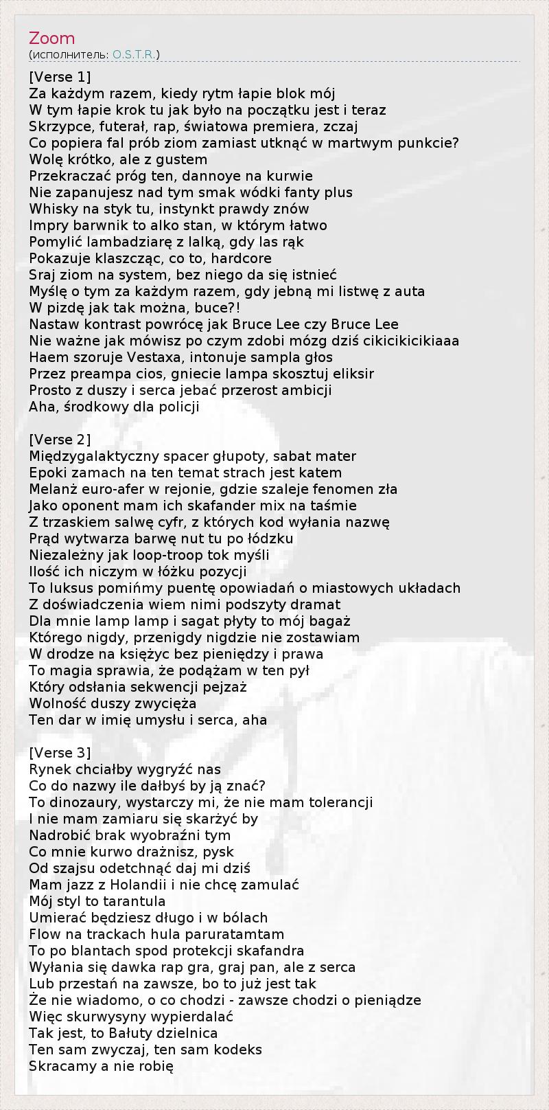 Это интересно:Адам Островски (польск. Adam Ostrowski) — (родился 15 мая, 1980 года в городе Лодзь, Польша), более известный под псевдонимом O.S.T.R. — один из наиболее популярных рэпперов Польши.Наиболее известен своими фристайл навыками. В своих произведениях затрагивает различные темы, начиная от курения марихуаны, заканчивая актуальными общественно-политическими и социальными проблемами.Работал на... продолжение