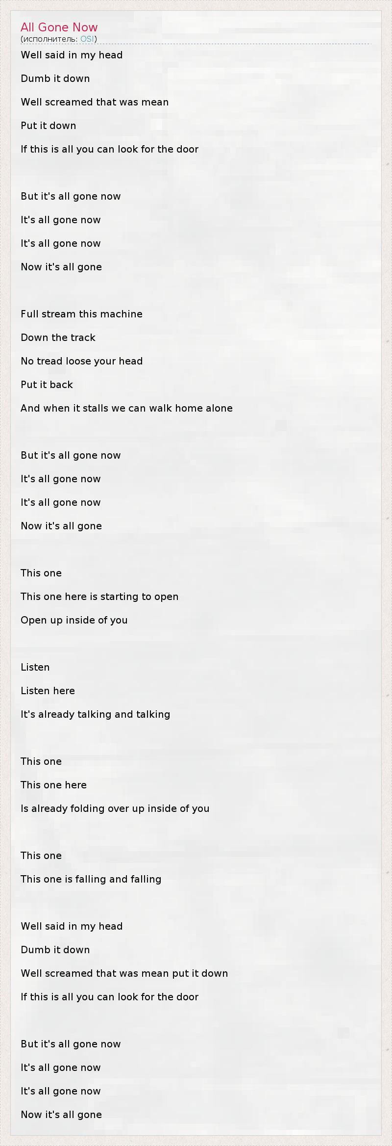 Well said in my head Dumb it down Well screamed that was mean Put it down If this is all you can look for the door But it's all gone now It's all gone now It's all gone now Now it's all gone Full stream this machine Down the track No tread loose your head Put it back And when it stalls we can walk home alone But it's all gone now It's all gone now It's all gone now Now it's all gone This one This one here is starting to open Open up inside of you Listen Listen here It's already talking and talking This one This one here Is already folding over up inside of you This one This one is falling and falling Well said in my head Dumb it down Well screamed that was mean put it down If this is all you can look for the door But it's all gone now It's all gone now It's all gone now Now it's all gone